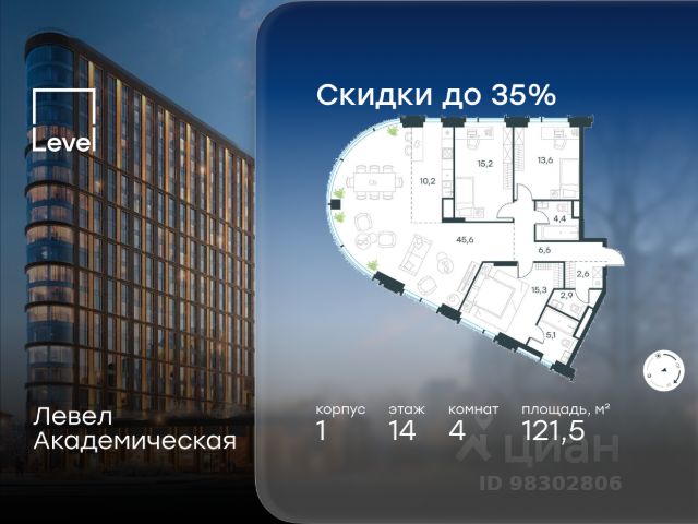 Цена указана с учётом скидки при 100%-й оплате, несубсидированной ипотеке, рассрочке (кроме программы "Рассрочка 0%"). В Академическом районе продаётся 4-комнатная квартира площадью 101.20 кв.м без отделки. Квартира расположена на 17-м этаже 19-этажного жилого комплекса бизнес-класса Левел Академическая (компания Level Group). Площади помещений определены кадастровым инженером по результатам обмеров. Отличная транспортная доступность: - 1 мин. пешком до станции метро "Академическая"; - 4 мин. на автомобиле до ТТК; - 8 мин. на автомобиле до Садового кольца; - 13 мин. на автомобиле до Кремля. Продуманный архитектурный проект: - современная архитектура от бюро UNK project; - высокие потолки в квартирах до 6,62 м; - окна в пол высотой 2,5-2,68 м с панорамным видом на МГУ, Москва-Сити и другие доминанты Москвы; - квартиры с моллированным остеклением - радиусные окна открывают увеличенный угол обзора; - более 20 вариантов планировочных решений; - уникальные квартиры с собственным патио и возможностью обустройства дровяного камина; - квартиры сдаются без отделки, что открывает свободу для создания интерьера по своему вкусу. Расположение: Камерный проект из 1 корпуса расположен тихом зеленом районе Москвы, в непосредственной близости к центру города. В округе построено 80 детских садов, 50 школ и 30 вузов, 7 из которых входят в топ100 вузов России: МГУ, МГИМО, РАНХиГС, МИСИС, РУДН, РЭУ им. Плеханова и РГУ нефти и газа им. Губкина. Этот район буквально утопает в зелени парков, начиная с уютного Академического в 6 минутах пешком и заканчивая одним из крупнейших в городе парком 50-летия Октября (12 минут на автомобиле). Общая площадь природных объектов в радиусе 2-6 км от дома - 476,5 га. Внутренняя инфраструктура: На территории Левел Академическая откроется собственный торговый центр, а для отдыха жителей будут созданы общественные пространства: комфортное лобби с дизайнерской отделкой, окнами в пол и потолками высотой 4,5 м, а также две благоустроенные зоны - территория по периметру здания и пространство на стилобате. Во дворе на стилобате предусмотрены детская и спортивная площадки, коворкинг и лаунж-зона на открытом воздухе. Стилобат украсят скульптуры животных - жирафа, зайца и волка, которые станут ярким акцентом внутреннего двора Левел Академическая, подчеркивая близость к музею Дарвина. Процент озеленения территории - 58%. Технологии и безопасность: Жителей Левел Академическая не коснется ежегодное отключение горячей воды благодаря собственным центральным водонагревателям. Безопасность гарантирует круглосуточная охрана, безлимитный Wi-Fi, круглосуточное видеонаблюдение. Удобное перемещение внутри комплекса будут обеспечивать 5 лифтов с доступом в паркинг с жилых этажей.