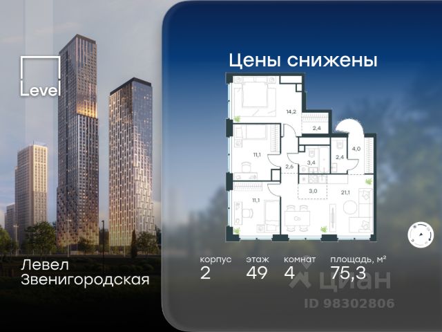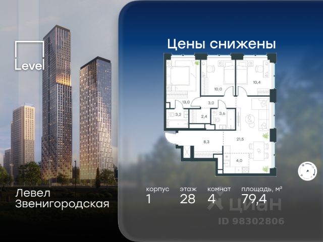 Цена указана с учётом скидки при 100%-й оплате, несубсидированной ипотеке, рассрочке (кроме программы "Рассрочка 0%"). Ключи в момент покупки! Квартира с террасой! В готовом жилом комплексе на набережной Москвы-реки продается 4-комнатная квартира площадью 104,6 кв.м без отделки. Квартира расположена на 21 этаже 32 этажного корпуса " Юг" в жилом комплексе бизнес-класса Левел Причальный (компания Level Group/Левел групп). Возможность купить машино-место в подземном паркинге. Отличная транспортная доступность - 7 мин. пешком до станции метро и МЦК "Шелепиха"; - 5 мин. на авто до ТТК; - 10 мин. на авто до Москва-Сити; - 13 мин. на авто до Садового кольца. Продуманный архитектурный проект - концепция от архитектурного бюро "Остоженка"; - окна высотой до 3,03 м и шириной до 4,3 м; - виды на МГУ, Москва-Сити, высотки на Смоленской и Кудринской площадях; - квартиры сдаются без отделки - отличный вариант для создания уникального интерьера. Технологии и безопасность - система приточной вентиляции обеспечит свежий воздух в квартирах; - собственные центральные водонагреватели - гарантия горячей воды в каждой квартире круглый год; - единый ключ доступа по всей территории ЖК; - высокоскоростные лифты OTIS. Благоустройство Дизайн внутренней территории жилого комплекса Левел Причальный разработан совместно со студией UpLand. Это уникальный двухуровневый двор с пространством для жителей любого возраста. Концепция игрового пространства верхнего яруса - каникулы на морском побережье. Дети постарше будут в восторге от большого скалодрома и песочницы-пляжа площадью 280 м², а для малышей - безопасная площадка с фигурой кита-полосатика по центру. Верхний и нижний уровни двора соединяет 90-метровый мост-пергола. Дети смогут спускаться с него по горкам, будто ныряя в пучину океана. На нижнем уровне всё располагает к размеренному отдыху: прогулкам, беседам, релаксу на шезлонгах, творческим вечерам в амфитеатре или командным активностям с соседями. Все общественные зоны жилого комплекса, включая двор и лобби, имеют доступ к сети вайфай. Внутренняя инфраструктура В жилом комплексе предусмотрен собственный торговый центр, супермаркет, фитнес-зал и другие сервисы. Просторные входные группы с потолками до 4,4 м подчёркивают статусность дома. Для удобства предусмотрены мойки для лап животных, кладовые, гостевые санузлы и теплый подземный паркинг на 694 машино-места. Инфраструктура района Жилой комплекс Левел Причальный расположен в районе Хорошёво-Мнёвники, одном из самых экологически чистых и престижных районов СЗАО Москвы. В 15-минутной доступности на авто - 50 детских садов, 22 школы, 5 торговых центров, десятки супермаркетов и фитнес-клубов. И совсем скоро Шелепихинская набережная, на которой расположен жилой комплекс, приобретет новый облик и станет одним из главных мест притяжения резидентов Левел Причальный.