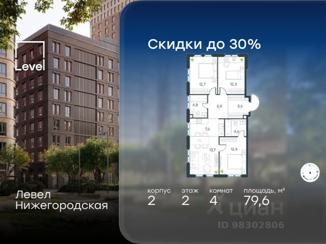 Цена указана с учётом скидки при 100%-й оплате, несубсидированной ипотеке, рассрочке (кроме программы "Рассрочка 0%"). В активно развивающемся районе на юго-востоке столицы продается 4-комнатная квартира площадью 79,6 кв.м без отделки.. Квартира расположена на 2 этаже 11-этажного этажного корпуса 2 в жилом комплексе комфорт-класса Левел Нижегородская (компания Level Group/Левел групп). Отличная транспортная доступность - 10 мин. пешком до станции метро, МЦД-4, БКЛ и МЦК "Нижегородская"; - 13 мин. пешком до станций метро "Андроновка" и "Перово"; - 10 мин. на авто до ТТК; - 14 мин. на авто до Садового кольца. Благоустройство Благоустроенная территория комплекса делится на внешнюю и внутреннюю. Внутренняя часть - это закрытый двор 0,9 га, где обустраиваются детские площадки для разных возрастных групп, беседки для отдыха и работы, несколько спортивных зон, включая воркаут-зоны и лужайку для бадминтона. Здесь же появится ухоженный луг с прогулочными маршрутами. Рядом с жилым комплексом будет создан ландшафтный парк площадью 2,4 га. В парке будут высажены высокие деревья, луговые травы и кустарники, благоустроены лаунж-зоны у пруда, дорожки для бега и прогулок. В центре парка предусмотрена событийная площадь, рядом расположатся дополнительные спортивные и детские площадки, а также зона для выгула домашних питомцев. Внутренняя инфраструктура Дома жилого комплекса будут оснащены коммерческими помещениями, где откроются все необходимые сервисы: магазины, аптеки, салоны красоты, кофейни, службы доставки и многое другое. Комфорт - это когда всё рядом. Кроме того, на территории жилого комплекса Левел Нижегородская предусмотрен подземный отапливаемый паркинг. Этап 1 включает 335 машино-мест и 143 кладовых помещения для хранения сезонных вещей. Технологии и безопасность На территории всех общественных зон постоянно ведется видеонаблюдение и предусмотрен высокоскоростной Wi-Fi. Подъезды, паркинг и внутренний двор оснащены системой контроля доступа. Для удобства жителей создано мобильное приложение, позволяющее связаться с управляющей компанией, осуществлять удаленное управление видеодомофоном или просмотреть изображение отдельных видеокамер по заявке. Для безопасного перемещения по этажам и комфортного спуска в паркинг будут установлены современные лифты от компании BLT Brilliant Elevator. Скорость лифтов - 1,6 - 2,5 м/с. Особенности - Архитектура от экспертов из бюро ARCH(E)TYPE; - Разноуровневая застройка - от секций средней этажности до высоток в 45 этажей (этап 1); - Окна шириной до 2,2 метров (этап1) с видами на Останкинскую башню, Измайловский парк, "Москва-Сити" и Кусковский лесопарк; - Лобби с окнами в пол и потолками от 3,4 метров, оснащенные консьерж-сервисом; - Более 35 видов планировок, включая редкие форматы. Артикул 2-1-4.