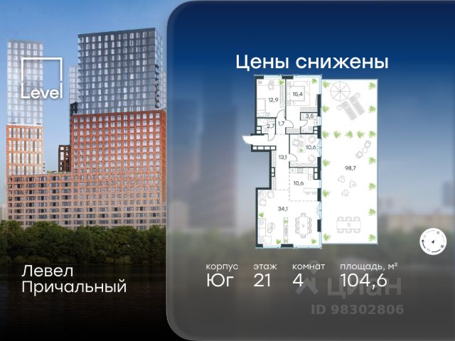 Цена указана с учётом скидки при 100%-й оплате, несубсидированной ипотеке, рассрочке (кроме программы "Рассрочка 0%"). Ключи в момент покупки! Квартира с террасой! В готовом жилом комплексе на набережной Москвы-реки продается 4-комнатная квартира площадью 104,6 кв.м без отделки. Квартира расположена на 21 этаже 32 этажного корпуса " Юг" в жилом комплексе бизнес-класса Левел Причальный (компания Level Group/Левел групп). Возможность купить машино-место в подземном паркинге. Отличная транспортная доступность - 7 мин. пешком до станции метро и МЦК "Шелепиха"; - 5 мин. на авто до ТТК; - 10 мин. на авто до Москва-Сити; - 13 мин. на авто до Садового кольца. Продуманный архитектурный проект - концепция от архитектурного бюро "Остоженка"; - окна высотой до 3,03 м и шириной до 4,3 м; - виды на МГУ, Москва-Сити, высотки на Смоленской и Кудринской площадях; - квартиры сдаются без отделки - отличный вариант для создания уникального интерьера. Технологии и безопасность - система приточной вентиляции обеспечит свежий воздух в квартирах; - собственные центральные водонагреватели - гарантия горячей воды в каждой квартире круглый год; - единый ключ доступа по всей территории ЖК; - высокоскоростные лифты OTIS. Благоустройство Дизайн внутренней территории жилого комплекса Левел Причальный разработан совместно со студией UpLand. Это уникальный двухуровневый двор с пространством для жителей любого возраста. Концепция игрового пространства верхнего яруса - каникулы на морском побережье. Дети постарше будут в восторге от большого скалодрома и песочницы-пляжа площадью 280 м², а для малышей - безопасная площадка с фигурой кита-полосатика по центру. Верхний и нижний уровни двора соединяет 90-метровый мост-пергола. Дети смогут спускаться с него по горкам, будто ныряя в пучину океана. На нижнем уровне всё располагает к размеренному отдыху: прогулкам, беседам, релаксу на шезлонгах, творческим вечерам в амфитеатре или командным активностям с соседями. Все общественные зоны жилого комплекса, включая двор и лобби, имеют доступ к сети вайфай. Внутренняя инфраструктура В жилом комплексе предусмотрен собственный торговый центр, супермаркет, фитнес-зал и другие сервисы. Просторные входные группы с потолками до 4,4 м подчёркивают статусность дома. Для удобства предусмотрены мойки для лап животных, кладовые, гостевые санузлы и теплый подземный паркинг на 694 машино-места. Инфраструктура района Жилой комплекс Левел Причальный расположен в районе Хорошёво-Мнёвники, одном из самых экологически чистых и престижных районов СЗАО Москвы. В 15-минутной доступности на авто - 50 детских садов, 22 школы, 5 торговых центров, десятки супермаркетов и фитнес-клубов. И совсем скоро Шелепихинская набережная, на которой расположен жилой комплекс, приобретет новый облик и станет одним из главных мест притяжения резидентов Левел Причальный.