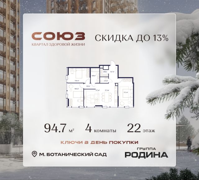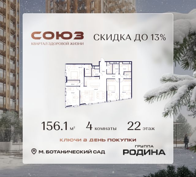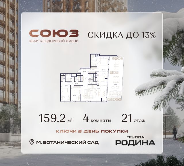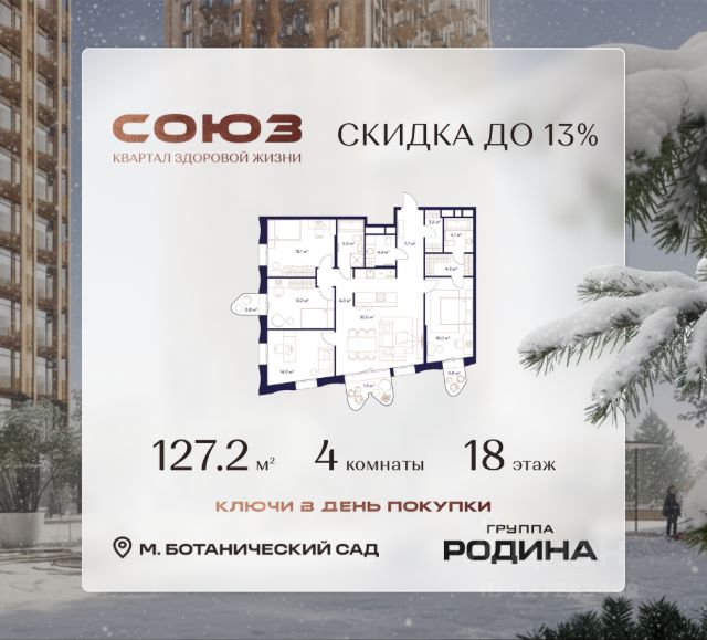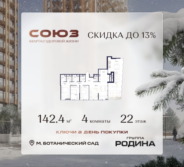 Рассрочка 0% Продаётся 4-комнатная квартира площадью 120.7 м² на 9 этаже в Жилом Комплексе "Союз". Квартал здоровой жизни премиум-класса с рекордным количеством олимпийских видов спорта: - Ледовая арена для хоккея и фигурного катания, - Футбольные поля для тренировок, - Спортивный зал для фехтования, - Бассейн на 6 дорожек, - Центр единоборств, - 4 крытых площадки для настольного тенниса, - 7 теннисных кортов (крытых и открытых), - 4 крытых площадки для сквоша, - Легкоатлетический стадион, - Площадки для баскетбола и волейбола. Уникальные форматы квартир с мастер-спальнями, приватными террасами, балконами, а также пентхаусы с открыточными видами на город. Все квартиры продаются с отделкой Shell&Core и панорамным остеклением. Расположение Пешком: - 2 мин. до парка "Сад Будущего"; - 6 мин. до ст. м. "Ботанический сад"; - 6 мин. до ст. МЦК "Ботанический сад"; - 6 мин. до парка "Леоновская роща"; На автомобиле: - 2 мин. до СВХ (МСД); - 5 мин. до Проспекта Мира; - 10 мин. до ТТК; - 15 мин. до Садового кольца; - 25 мин. до аэропорта "Шереметьево". Благоустройство - собственная спортивная инфраструктура 7 Га; - зона для пикников; - игровые и спортивные площадки для детей всех возрастов; - розарий, а также сосновые, каштановые и дубовые аллеи; - площадки под открытым небом для занятий спортом и йоги; - игровые комнаты для детей; - лаунж-зона для резидентов; - просторная переговорная для деловых встреч; - премиальный ресторан "Шабада" Сосо Павлиашвили с водными арт-объектами на прогулочной аллее, садом ароматных трав и сценой под открытым небом; - кафе, химчистки, аптеки и супермаркеты рядом с домом. Окружение - 8 парков: Сад Будущего, Леоновская роща, Хуамин, Главный ботанический сад РАН, Шереметьевская дубрава, Останкино, парк спорта "Яуза", пойма реки Яуза и музей-усадьба "Останкино"; - 3 ВУЗа: ВГИК, РГСУ, МГПУ; - 12 школ, в том числе: школа 1499 им. И.А. Докукина (топ 100), Brookes Moscow, IThub школа; - 18 детских садов, в том числе билингвальный ALERTUM KIDS; - один из крупнейших океанариумов Европы "Москвариум"; - один из крупнейших в Европе торгово-развлекательных центров "Европолис".