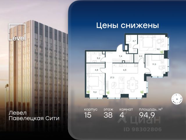 Цена указана с учётом скидки при 100%-й оплате, несубсидированной ипотеке, рассрочке (кроме программы "Рассрочка 0%"). В Даниловском районе столицы (ЮАО) продаётся 4-комнатная квартира площадью 94.90 кв.м c предчистовой отделкой. Квартира расположена на 38 этаже 45-этажного корпуса 15 в жилом комплексе бизнес-класса Левел Павелецкая Сити. Высота потолков 3.00м. Престижная локация Жилой комплекс бизнес-класса Левел Павелецкая Сити расположен в престижном Даниловском районе Москвы - историческом центре города в окружении парков, Москвы-реки и новейшей инфраструктуры. В 20 минутах пешком есть 3 станции метро, а в 5 минутах езды на авто - ТТК и Садовое кольцо. - 15 мин. пешком до метро "Павелецкая"; - 20 мин. пешком до станций "Тульская" и "Серпуховская"; - 8 мин. на авто до Кремля; - 10 мин. на авто до парка Горького и парка "Зарядье"; - 20 мин. на авто до башен "Москва-Сити". Авторская архитектура Авторская архитектура Авторская архитектурная концепция разработана бюро СПИЧ. Облик корпусов этапов 1 и 2 отсылает к стилистике архитектуры классического Нью-Йорка и золотой эпохи Голливуда. Корпуса этапа 4 вдохновлены эстетикой ар-деко. Умное линейное расположение корпусов гарантирует потрясающие виды на исторический центр и Москву-реку из большинства квартир. Дизайнерские лобби Изысканные интерьеры лобби жилого комплекса отсылают к классическим фильмам золотой эпохи Голливуда. Классика в жилом комплексе Левел Павелецкая Сити - не имитация, а современное осмысление лучшего в этом стиле. В каждом вестибюле оборудованы стойки ресепшен, комфортные зоны ожидания, гостевые санузлы, мойки для лап животных, колясочные. В корпусах по 3-4 лифта с прямым доступом в паркинг. Площадь лобби - от 47,9 до 114,9 кв. м, высота потолков - до 5,46 м. Благоустройство и инфраструктура Для создания благоустройства было приглашено 2 ведущих бюро - ADM и GAFA. Разноуровневое пространство вмещает в себя игровые площадки для детей всех возрастов, тропы здоровья для пеших прогулок, крытые аллеи с качелями, места для работы на свежем воздухе, многофункциональные спортивные площадки - зоны уличных тренировок, столы для пинг-понга, зоны командных игр. Общая площадь закрытого двора - 4,63 га. Комфорт - это когда рядом всё, что нужно для жизни. В жилом комплексе Левел Павелецкая Сити размещены 85 коммерческих помещений, где откроются супермаркеты, кафе, аптеки и многое другое. В составе проекта также предусмотрены собственный фитнес-клуб, развивающий центр Летово Кидс. Технологии и безопасность - Вайфай в лобби и на придомовой территории; - Автоматизированная система контроля и учета ресурсов; - Круглосуточное видеонаблюдение и охрана; - Круглосуточная связь с охраной через приложение, телефон или кол-центр; - Контроль доступа по биометрической системе распознавания лица; - Усиленный сотовый сигнал в лифтах и паркинге; - Распознавание номеров автомобилей при въезде/выезде в/из паркинга.