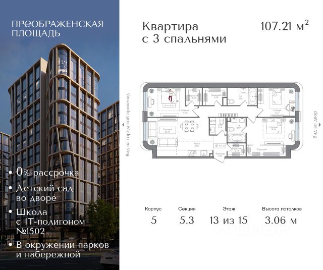 Рассрочка 0% от застройщика. Первоначальный взнос от 20%. Предложение действует до 31 декабря 2025 года Квартира на 13 этаже в жилом комплексе премиум-класса "Преображенская площадь". Общая площадь: 107.21 кв.м. Проект премиум-класса в историческом районе Москвы. До метро "Преображенская площадь" 3 минуты пешком. Квартиры сдаются без отделки и в свободной планировке, чтобы жители могли оформить пространство с учетом своей индивидуальности. Высота потолков от 3,15м, широкоформатное остекление, 3-5 квартир на этаже. Система Умный дом. Дизайнерские лобби. Внутренний двор 1,5 га функциональное и безопасное пространство для игр, работы и занятий спортом. Пешеходный променад для прогулок. Дома переменной этажности. Есть подземный паркинг. Жилой комлекс находится в окружении парков Сокольники, Черкизовский, Измайловский, заповедника Лосиный остров и ВДНХ, а также вблизи пешеходной набережной. Комфортная удаленность от центра: 7 минут на автомобиле до ТТК, 8 минут до Садового кольца, 25 минут до Кремля.
