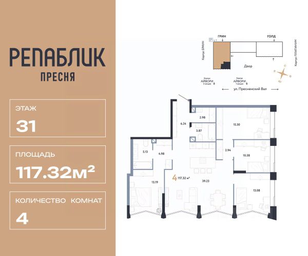 Рассрочка 0% с первым взносом от 20%, ипотека с субсидией или наличные. Подберём способ оплаты индивидуально. Продается 5комнатная квартира на 22 этаже от застройщика Страна Девелопмент. Площадь квартиры 129.51 кв. м. Дизайн-квартал "Republic" — новый проект премиум-класса в Москве от федерального застройщика "Страна Девелопмент". ЦАО, Пресня, 7 мин. от метро "Белорусская". 10 жилых башен и 4 восстановленных здания локомотивного депо образуют уникальное пространство. "Republic" — место, где вы ощутите гармонию истории и современности. За 12 мин. вы сможете дойти до Московского зоопарка, за 10 мин. на авто доехать до Патриарших прудов и Белого дома. Преимущества • Благоустройство. SPA-комплекс с бассейном и термами, гастрономический, учебный и шопинг-центры, приватный бульвар и яркие арт-пространства — для жителей предусмотрены все элементы премиального комфорта. • Панорама на центр. Наслаждайтесь видами ЦАО каждый день: панорама на историческую Пресню и башни Москва-Сити — из своей квартиры или с приватной террасы на крыше. • Концептуальное лобби в каждой башне. С общей террасой на кровле, с библиотекой, коворкингом и фитнес-рум. Стойка консьержа перетекающая в бар и др. • Современные форматы квартир. Свободные планировки, с террасой или балконом, с возможностью установки камина, от 1-комнатных до пентхаусов. • Отделка Квартиры сдаются без отделки или в формате White box. При White box уже выполнены все шумные и грязные работы: произведена разводка электричества с подрозетниками, установлены откосы из гипсокартона, устроена стяжка пола с шумоизоляцией и др. Способы покупки Сотрудники "Страна Девелопмент" будут сопровождать вас на каждом этапе сделки, помогут получить одобрение по ипотеке или снизить ежемесячный платеж. - ипотека (стандартная/с субсидией/траншевая) - рассрочка (с ПВ от 20%) - с использованием материнского капитала - оплата наличными