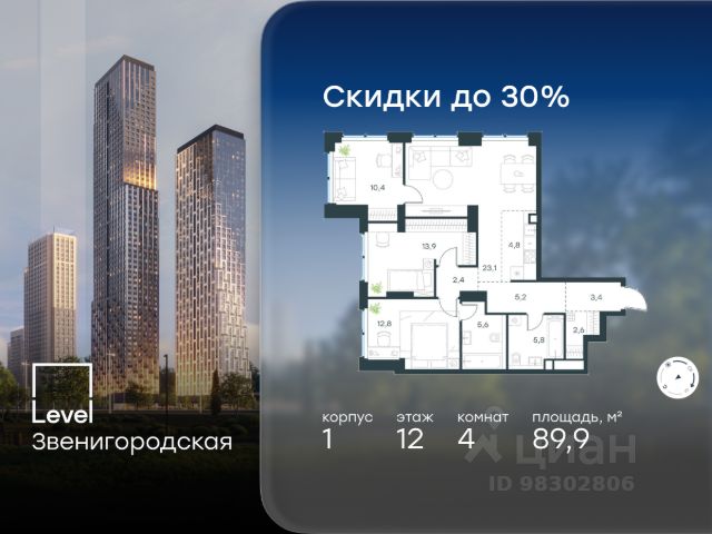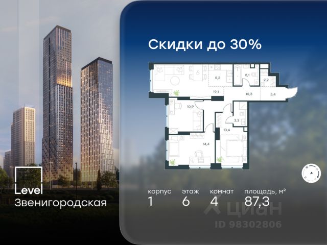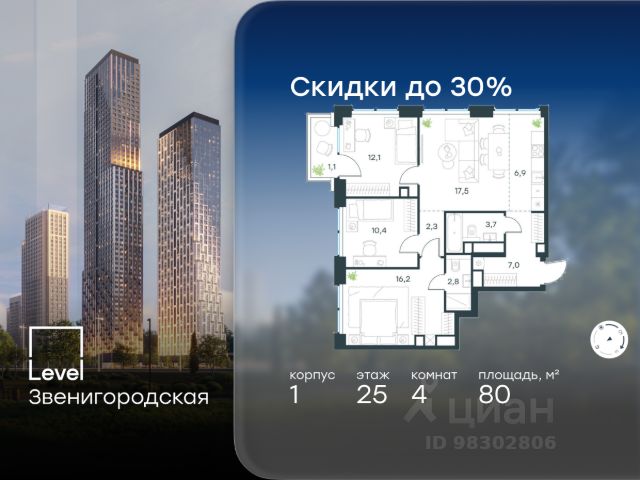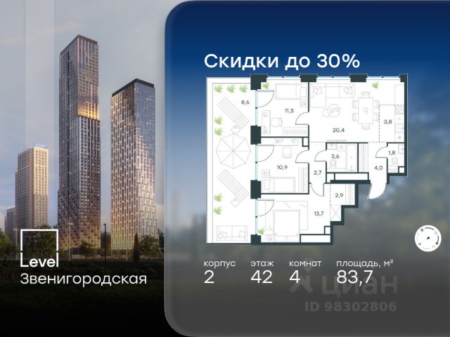 Цена указана с учётом скидки при 100%-й оплате, несубсидированной ипотеке, рассрочке (кроме программы "Рассрочка 0%"). В жилом квартале продаётся 4-комнатная квартира площадью 87.30 кв.м white box. Квартира расположена на 6 этаже 48 этажного корпуса 1 в жилом комплексе комфорт класса Level Звенигородская (компания Level Group/Левел групп). Отличная транспортная доступность - 5 мин. пешком до метро "Звенигородская" (откроется к окончанию строительства); - 18 мин. пешком до станции МЦК "Хорошёво" и станции БКЛ "Народное ополчение"; - 4 мин. на авто до ТТК; - 8 мин. на авто до Садового кольца; - 15 мин. на авто до Кремля. Продуманный архитектурный проект - Концепция от студии Станислава Михаловского, в основу которой легло единение природы и города; - Двухкамерные стеклопакеты в окнах, алюминиевый и ПВХ профиль - в квартирах тепло зимой и прохладно летом; - С верхних этажей откроются панорамные виды на город, Москву-реку, "Москва-Сити" и Москворецкий парк; - Лобби со всеми удобствами: окна в пол, высокие потолки до 4,7 м, лаунж-зоны, колясочные, гостевые санузлы и мойки для лап животных; - Централизованные водонагреватели гарантируют круглогодичную подачу горячей воды в каждую квартиру. Благоустройство Концепция благоустройства разработана совместно с бюро UNK landscape. Высота башен приближается к 200 метрам - они словно касаются неба. Небесный простор проецируется на территорию двора с помощью подсветки, визуально увеличивая пространство и отражаясь в авторских элементах архитектуры. На территории площадью 0,45 га расположатся: - "Облако событий" - место встреч и общения; - "Облако спорта" - всё для поддержания себя в форме; - "Облако принятия решений" - пространство для работы на свежем воздухе; - "Облако спокойствия" - для отдыха в тишине природы; - "Облако игр" - площадки для подростков и самых маленьких. Инфраструктура В жилом комплексе откроется 21 коммерческое помещение: продуктовые лавки, кафе, салоны красоты, службы доставки и творческие студии. Этап 1 включает строительство двухуровневого подземного паркинга. Всего здесь расположится 351 машино-место, включая семейные места, и 264 кладовых помещения. В распоряжении жителей развитая инфраструктура района: 15 супермаркетов, 5 спортивных объектов, 9 медучреждений, 7 детских садов, 4 школы, 3 благоустроенных парка - всё в шаговой доступности. Инженерия Комфортное перемещение внутри домов будут обеспечивать надёжные лифты с доступом в паркинг с жилых этажей. В каждом корпусе предусмотрено до шести кабин, включая сервисные лифты. Попасть на территорию комплекса можно только по единому ключу доступа. Видеонаблюдение установлено на входах в подъезды, в лобби, в общих зонах, на въезде в паркинг. Гости смогут связаться с жителями дома через входные видеопанели, а управлять доступом на территорию можно через видеодомофон или приложение на телефоне.