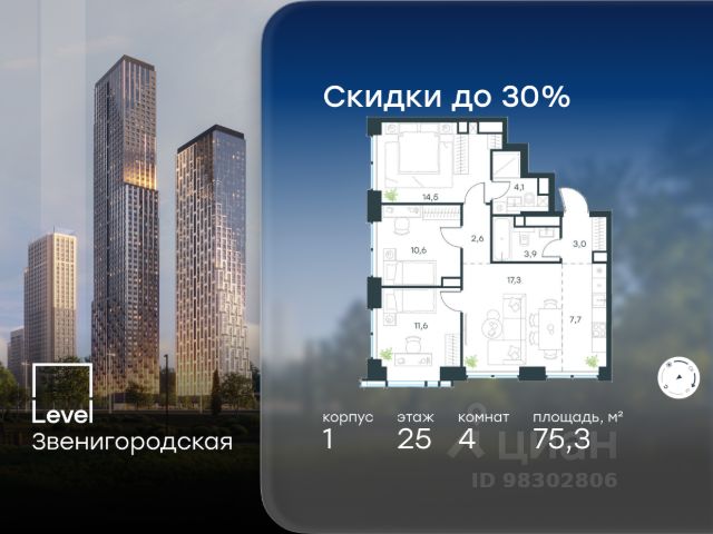 Цена указана с учётом скидки при 100%-й оплате, несубсидированной ипотеке, рассрочке (кроме программы "Рассрочка 0%"). В жилом квартале продаётся 4-комнатная квартира площадью 87.30 кв.м white box. Квартира расположена на 6 этаже 48 этажного корпуса 1 в жилом комплексе комфорт класса Level Звенигородская (компания Level Group/Левел групп). Отличная транспортная доступность - 5 мин. пешком до метро "Звенигородская" (откроется к окончанию строительства); - 18 мин. пешком до станции МЦК "Хорошёво" и станции БКЛ "Народное ополчение"; - 4 мин. на авто до ТТК; - 8 мин. на авто до Садового кольца; - 15 мин. на авто до Кремля. Продуманный архитектурный проект - Концепция от студии Станислава Михаловского, в основу которой легло единение природы и города; - Двухкамерные стеклопакеты в окнах, алюминиевый и ПВХ профиль - в квартирах тепло зимой и прохладно летом; - С верхних этажей откроются панорамные виды на город, Москву-реку, "Москва-Сити" и Москворецкий парк; - Лобби со всеми удобствами: окна в пол, высокие потолки до 4,7 м, лаунж-зоны, колясочные, гостевые санузлы и мойки для лап животных; - Централизованные водонагреватели гарантируют круглогодичную подачу горячей воды в каждую квартиру. Благоустройство Концепция благоустройства разработана совместно с бюро UNK landscape. Высота башен приближается к 200 метрам - они словно касаются неба. Небесный простор проецируется на территорию двора с помощью подсветки, визуально увеличивая пространство и отражаясь в авторских элементах архитектуры. На территории площадью 0,45 га расположатся: - "Облако событий" - место встреч и общения; - "Облако спорта" - всё для поддержания себя в форме; - "Облако принятия решений" - пространство для работы на свежем воздухе; - "Облако спокойствия" - для отдыха в тишине природы; - "Облако игр" - площадки для подростков и самых маленьких. Инфраструктура В жилом комплексе откроется 21 коммерческое помещение: продуктовые лавки, кафе, салоны красоты, службы доставки и творческие студии. Этап 1 включает строительство двухуровневого подземного паркинга. Всего здесь расположится 351 машино-место, включая семейные места, и 264 кладовых помещения. В распоряжении жителей развитая инфраструктура района: 15 супермаркетов, 5 спортивных объектов, 9 медучреждений, 7 детских садов, 4 школы, 3 благоустроенных парка - всё в шаговой доступности. Инженерия Комфортное перемещение внутри домов будут обеспечивать надёжные лифты с доступом в паркинг с жилых этажей. В каждом корпусе предусмотрено до шести кабин, включая сервисные лифты. Попасть на территорию комплекса можно только по единому ключу доступа. Видеонаблюдение установлено на входах в подъезды, в лобби, в общих зонах, на въезде в паркинг. Гости смогут связаться с жителями дома через входные видеопанели, а управлять доступом на территорию можно через видеодомофон или приложение на телефоне.