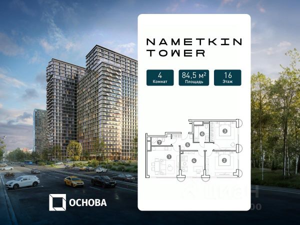 Этот лот вы можете приобрести с ПВ всего 30% в рассрочку под 0%. Продаются 4-к апартаменты площадью 90.4 кв.м. на 27-м этаже 29 этажного дома в "NAMETKIN TOWER" от ГК ОСНОВА. Есть возможность приобретения лотов с отделкой white box. Nametkin Tower с двухуровневым подземным паркингом и обширной инфраструктурой будет построен в районе Черемушки по адресу: ул. Намёткина, вл. 10, рядом с Битцевским лесопарком и Воронцовским парком. Архитектура от известного бюро Mecanoo из Нидерландов. Новый комплекс на Наметкина, 10 включает 4 секции переменной этажности 24-29 этажей, двухуровневый подземный паркинг. В каждой секции запроектированы лобби с мягкими рекреационными зонами, консьерж-сервисом 24/7, колясочными, комнатами для матери и ребенка и гостевыми санузлами. На 25 этаже расположится досуговая зона на открытом воздухе с выходом на тематические площадки. К услугам резидентов Nametkin Tower будет предоставлена максимально насыщенная внутренняя инфраструктура: ресторан, супермаркет, спортивный центр, зал для проведения мероприятий, теннисные и бильярдные столы, коворкинг, Sky Bar, а также собственный медицинский центр и SPA. Дополнением станет благоустройство по авторской концепции Mecanoo, разделенное на два пространства: общественное вдоль улицы Намёткина, где будут располагаться входы в ресторан и магазины, а также приватное дворовое пространство, выполненное в концепции ""двор без машин"". В основе проектирования всех лотов лежит принцип оптимальной эргономики пространства и большая площадь остекления с высотой оконных проемов 2,7 м.
