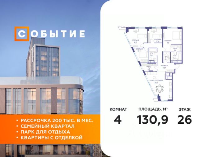 СОБЫТИЕ.6 — финальный дом парк-квартала СОБЫТИЕ на Мосфильмовской. Переезжайте в уже сформированный квартал с готовой инфраструктурой и парком! Премиальный жилой комплекс в престижном районе Москвы предлагает стильную архитектуру, продуманное благоустройство и великолепно разнообразие общественных пространств. Свой парк прямо возле дома!