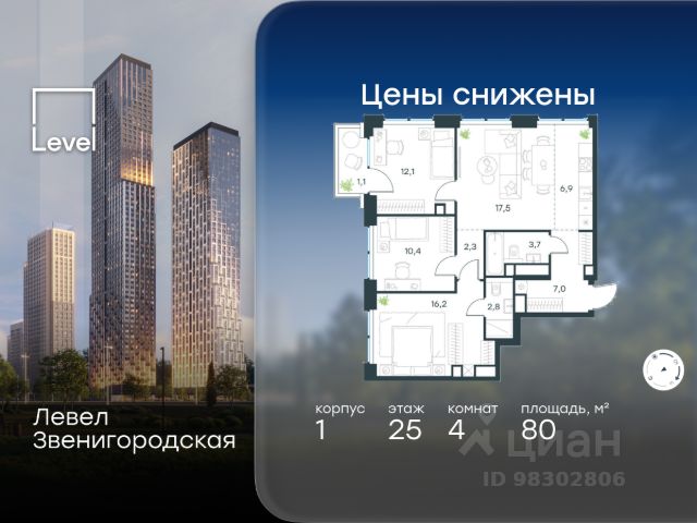 Цена указана с учётом скидки при 100%-й оплате, несубсидированной ипотеке, рассрочке (кроме программы "Рассрочка 0%"). В жилом квартале продаётся 4-комнатная квартира площадью 80.00 кв.м с предчистовой отделкой. Квартира расположена на 25 этаже 48 этажного корпуса 1 в жилом комплексе комфорт класса Левел Звенигородская (компания Level Group/Левел групп). Отличная транспортная доступность - 5 мин. пешком до метро "Звенигородская" (откроется к окончанию строительства); - 18 мин. пешком до станции МЦК "Хорошёво" и станции БКЛ "Народное ополчение"; - 4 мин. на авто до ТТК; - 8 мин. на авто до Садового кольца; - 15 мин. на авто до Кремля. Продуманный архитектурный проект - Концепция от студии Станислава Михаловского, в основу которой легло единение природы и города; - Двухкамерные стеклопакеты в окнах, алюминиевый и ПВХ профиль - в квартирах тепло зимой и прохладно летом; - С верхних этажей открываются панорамные виды на город, Москву-реку, "Москва-Сити" и Москворецкий парк; - Лобби со всеми удобствами: окна в пол, высокие потолки до 4,7 м, лаунж-зоны, колясочные, гостевые санузлы и мойки для лап животных; - Централизованные водонагреватели гарантируют круглогодичную подачу горячей воды в каждую квартиру. Благоустройство Концепция благоустройства разработана совместно с бюро UNK landscape. Высота башен приближается к 200 метрам - они словно касаются неба. Небесный простор проецируется на территорию двора с помощью подсветки, визуально увеличивая пространство и отражаясь в авторских элементах архитектуры. На территории площадью 0,45 га расположатся: - "Облако событий" - место встреч и общения; - "Облако спорта" - всё для поддержания себя в форме; - "Облако принятия решений" - пространство для работы на свежем воздухе; - "Облако спокойствия" - для отдыха в тишине природы; - "Облако игр" - площадки для подростков и самых маленьких. Инфраструктура В жилом комплексе откроется 21 коммерческое помещение: продуктовые лавки, кафе, салоны красоты, службы доставки и творческие студии. Этап 1 включает строительство двухуровневого подземного паркинга. Всего здесь расположится 351 машино-место, включая семейные места, и 264 кладовых помещения. В распоряжении жителей развитая инфраструктура района: 15 супермаркетов, 5 спортивных объектов, 9 медучреждений, 7 детских садов, 4 школы, 3 благоустроенных парка - всё в шаговой доступности. Инженерия Комфортное перемещение внутри домов будут обеспечивать надёжные лифты с доступом в паркинг с жилых этажей. В каждом корпусе предусмотрено до шести кабин, включая сервисные лифты. Попасть на территорию комплекса можно только по единому ключу доступа. Видеонаблюдение установлено на входах в подъезды, в лобби, в общих зонах, на въезде в паркинг. Гости смогут связаться с жителями дома через входные видеопанели, а управлять доступом на территорию можно через видеодомофон или приложение на телефоне.