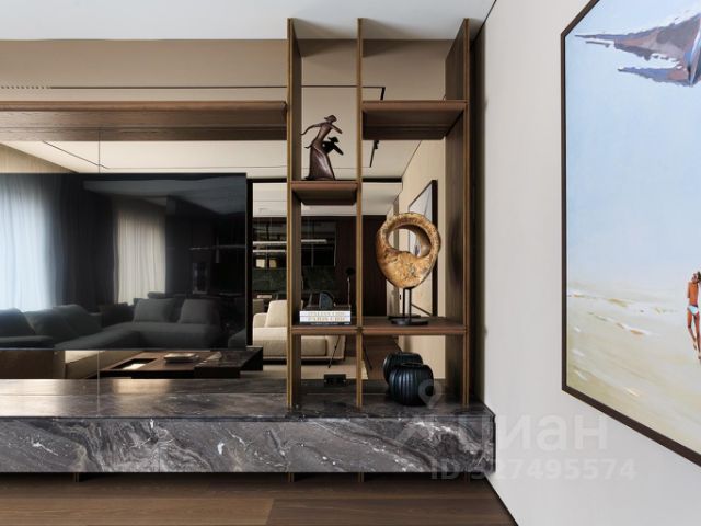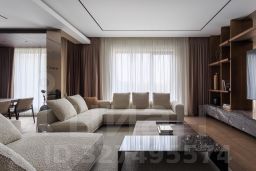 В квартире выполнена премиальная дизайнерская отделка с использованием высококачественных и натуральных материалов, таких как: натуральный мрамор, анодированная бронза, натуральный итальянский шпон, анодированная латунь.