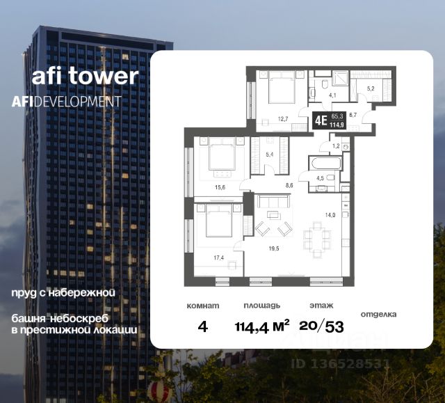 4-комнатная квартира площадью 100,4 кв.м., расположенная на 2 этаже 53-этажного небоскреба бизнес-класса это именно то, что вы ищете! AFI Tower — это не просто жилой комплекс. Это место, где каждая деталь заботливо продумана, чтобы сделать вашу жизнь удивительной и комфортной. Транспортная доступность - AFI Tower расположен близко к проезду Серебрякова, что обеспечивает быстрый доступ к Третьему Транспортному Кольцу и МКАД. За 15 минут можно легко добраться до ключевых транспортных магистралей в зависимости от дорожной ситуации. - В пешей доступности находятся станции метро "Свиблово" и "Ботанический сад" — это дает возможность жителям легко перемещаться по городу. Рядом также расположена станция Московского центрального кольца у "Ботанического сада". Архитектура: - Башня AFI Tower привлекает своим смелым архитектурным решением. Фасад, выполненный в виде мягкой волны, делает здание узнаваемым и уникальным в контексте стандартных высоток. С высотой в 182,4 метра, она становится неповторимой доминантой в Свиблово. Внутренняя инфраструктура: - Лобби AFI Tower выделяется современным дизайном, высокими потолками от 2,9 м до 3,3 м и использованием качественных материалов. Это визитная карточка здания, предоставляющая посетителям первое впечатление. Внутреннее пространство продумано для комфорта и функциональности. Характеристики квартир: - Здесь каждая квартира — уникальная история. От 19 до 116 м² площади, три варианта отделки — светлый, темный или white box, чтобы ваш дом отражал ваш вкус и стиль. Принимайте решение не просто о покупке жилья, а о создании своего собственного уютного уголка. Удобства внутри AFI Tower: - В самом доме целый мир удобств и развлечений. Ресторан, библиотека, прачечная и коворкинг — каждое место наполнено энергией и возможностями. Вечерами, уютная кинозона с кинопроектором и настольными играми создает атмосферу веселья и отдыха. Экология и окружение: - Жить в AFI Tower — значит быть частью уникального окружения. Близость к пруду и зеленому скверу придает местности неописуемое очарование. Вид из окон на Москву, ВДНХ и парки создают вдохновляющий пейзаж. А безопасность и удобство парковки добавляют приятные моменты к вашему образу жизни.