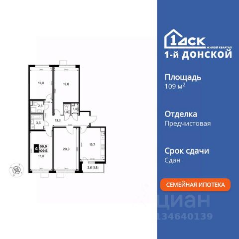 Прямая продажа от застройщика! Жилой Комплекс класса Комфорт Плюс. Продаётся 4-к квартира номер 274 общей площадью 109.5 кв.м. на 20-м этаже 24 этажного здания. Предчистовая отделка. Цена с учётом скидки. Особенности квартиры: - МЦД-5 в пешей доступности - Квартал с собственной набережной - Свои 2 детских сада и школа - Организуем показ в удобное для вас время! - Просторная спальня, в которой можно разместить большую кровать. - Гостевой санузел - комфорт и удобство для ваших гостей. - Раздельный санузел - больше удобства для всех членов семьи. - Просторная кухня - место для семейных ужинов и кулинарных экспериментов. - Просторная мягкая зона - комфорт и уют для отдыха всей семьи. - Возможность добавить спальное место - дополнительный комфорт для гостей. - Гардеробная - удобство для хранения и организации вещей. - Ниша под шкаф - компактное и удобное место для вещей. - Лоджия - уютное место для отдыха и тишины. Квартира с предчистовой отделкой. Вам не придется заниматься черновыми и трудоёмкими работы, а чистовую отделку и дизайн - сделайте на свой вкус. Информация о комплексе: ЖК "1-й Донской" в 7 км от МКАД: гармония городского комфорта и природы. Квартиры на 2-3 стороны света, форма секций и разная этажность создают динамичную архитектуру. Тёплая палитра фасадов и подсветка подчеркивают образ. Рядом - Ермолинский парк, Видновский лесопарк и Жуковский парк. Природа воздействует на все уровни восприятия: от видов до звуков и ароматов. Идеальный баланс для жизни в гармонии с окружающей средой. Транспортная доступность: Комплекс удобно расположен в 7 км от МКАД по трассе М-4 Дон (через Видное). Расстояние до Каширского шоссе составляет 12 км. Добраться до метро и центра Москвы позволяет развитая сеть маршрутов общественного наземного транспорта. Действующая ж/д станция Калинина Павелецкого направления в 15-17 минутах ходьбы (МЦД-5 в 2025-2026 гг). Внутренняя инфраструктура: "1-й Донской": продуманная среда в развивающемся районе. На территории - муниципальные школа и 2 детских сада, поликлиника, торговый центр с площадью для мероприятий. Сеть пешеходных маршрутов ведёт к магазинам и кафе, отделённым от дорог зелёными фито-стенами. Сквозные подъезды с панорамным остеклением и входами с улицы и двора наполнены светом. Всё для комфортной жизни в шаговой доступности, от повседневных нужд до общественных пространств. Квартира с предчистовой отделкой - ваш дизайн без черновых работ