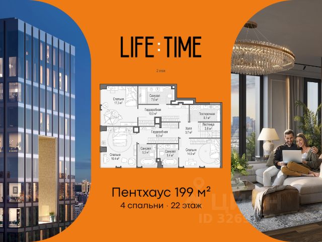 Просторная светлая квартира площадью 165,2 кв. м. Кухня-гостиная (33,7 кв. м) обращена окнами в сторону Москва-Сити, а спальни - на парк "Красногвардейские пруды". Продуманная планировка позволяет разместить кабинет и три спальни. Мастер-спальня с отдельным санузлом и гардеробом. Окна квартиры выходят на северную, западную и южную стороны. Life Time - роскошный современный квартал на Пресне, в наиболее быстро растущем премиальном районе ЦАО. Его насыщенная инфраструктура и выгодное расположение дарят время для жизни. Вы больше не тратите его на дорогу или ожидание, при этом ни в чём себе не отказывая. На территории предусмотрено всё для комфортной жизни: • двор-парк площадью 1,8 гектара с прудом и фонтанами; • Clubhouse - инфраструктурный центр в отдельном здании с исчерпывающими возможностями для спорта, отдыха и досуга только для жителей; • спортивная инфраструктура на улице и в помещении, в том числе бассейн длиной 25 метров, хот-таб, хаммам, сауна, бьюти-зона; • клубная гостиная с террасой; • всё для развития и досуга детей любого возраста, в том числе детский сад и школа. Life Time находится в центре сложившегося премиального района, в окружении многочисленных парков. Удобная транспортная доступность и прямой выезд на Звенигородское шоссе позволяют без проблем добраться до Садового кольца и Москва-Сити. Архитектурный стиль квартала - роскошный минимализм. Дома десятилетиями будут выглядеть современно.