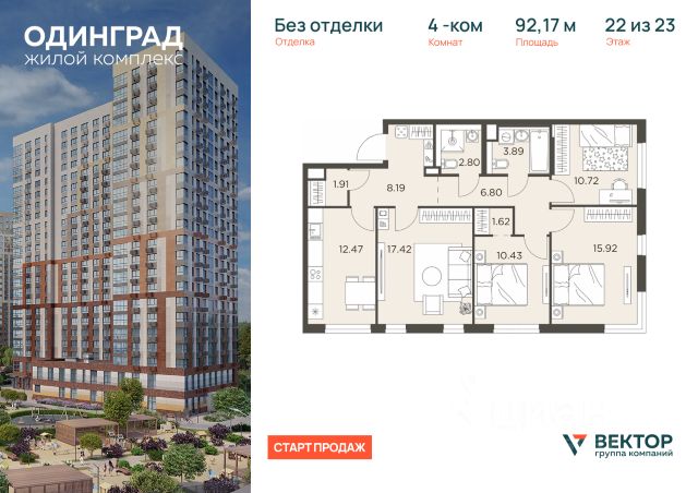 Дом сдан! Продается четырехкомнатная квартира без отделки в 7 фазе города-парка "Первый Московский". Общая площадь квартиры - 104 кв. м, этаж - 18 из 20. Тип дома - монолитный. ТОЛЬКО ДО 30 АПРЕЛЯ выгодные условия на приобретение квартиры в ипотеку или рассрочку. Звоните - и мы подберем оптимальное предложение под ваш запрос! Город-парк "Первый Московский" расположен всего в 7 км по Киевскому шоссе от МКАД на территории Новой Москвы. Из города-парка прямой выезд на Киевское шоссе и трассу Солнцево-Бутово-Варшавское шоссе. ТРАНСПОРТНАЯ ДОСТУПНОСТЬ: - 5 мин. на личном автомобиле или 10 мин. на автобусе 189 и 876 до станции метро "Филатов Луг" - 20 мин. пешком до станции метро "Филатов Луг" ИНФРАСТРУКТУРА И БЛАГОУСТРОЙСТВО: Около 7 фазы появятся детский сад, школа, 2 многоуровневых паркинга. Все жители 7 фазы смогут комфортно провести время рядом с домом: благоустройство включает в себя многоуровневую экотропу, велодорожки, сад камней с местами для отдыха, зоны для занятий спортом, детские площадки, центральную площадку с двухуровневой беседкой и качелями. Фасады корпусов имеют лаконичную прямоугольную форму, за счет чего органично вписываются в городской силуэт. В доме предусмотрен подвальный этаж для кладовых помещений, также в некоторых секциях (во 2-ой секции со 2 по 20 этаж) кладовые будут располагаться на этажах. В корпусе предусмотрено 10 коммерческих помещений свободного назначения на 1 этаже. АВТОРСКИЙ ДИЗАЙН: Входные группы выполнены по авторскому дизайну, оснащены системой "тёплый пол". В каждой входной группе будет располагаться комфортабельная зона ожидания с мягким диваном, акцентными пуфами и столиком. При входе предусмотрено помещение для хранения колясок и велосипедов.