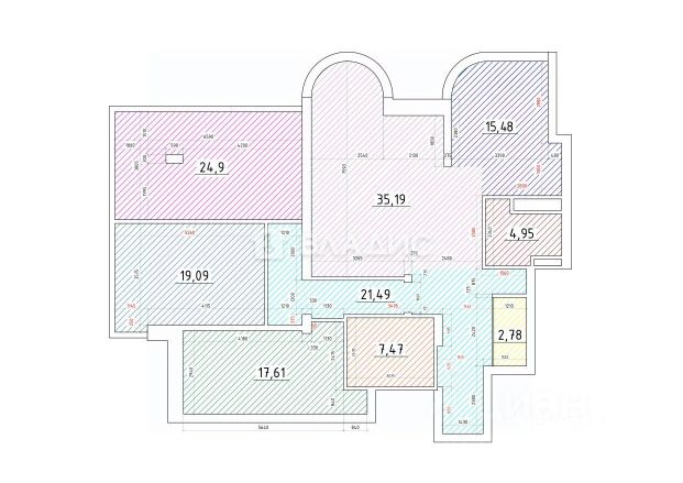 Планировка: просторная кухня-гостиная, 3 изолированные спальни, гардеробная, 2 совмещенных санузла (душевая + ванна с джакузи), на этаже имеется изолированный мусоропровод, комната хранения с выходом на общий балкон, два пассажирских и один грузовой лифт.