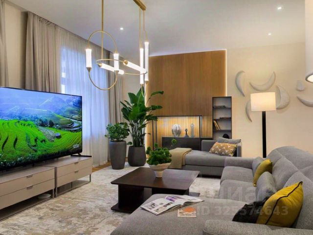 Планировка: гостиная с биокамином, кухня-столовая, мастер-спальня с собственной ванной комнатой и гардеробной, вторая спальня со своей гардеробной и санузлом, кабинет, который можно оборудовать как спальню, два санузла, гостевая гардеробная и холл. Окна ориентированы на две стороны света, открываются виды на благоустроенную территорию комплекса.