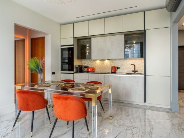 Высокие потолки 3.2 метра создают ощущение дополнительного объема и свободы, множество мест хранения сохраняют пространство визуально легким и просторным.