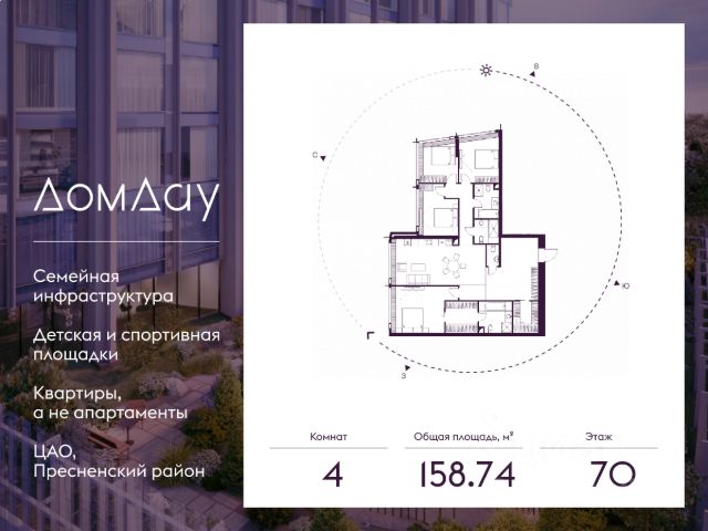 Продаётся 4-комнатная квартира на 50 этаже площадью 158.52 м² в "Дом Дау" - самом высоком жилом небоскребе России.* "Дом Дау" - уникальный небоскреб, воплощение премиум-класса в "Москва-Сити". Его расположение сочетает деловую динамику и уединение, а панорамные виды на 270 открывают захватывающие пейзажи Москвы-реки и города. Эксклюзивная инфраструктура обеспечивает непревзойденный комфорт, а архитектура от бюро СПИЧ и передовые технологии подчеркивают статус и стиль жизни. Исключительное расположение"Дом Дау" расположен в деловом кластере "Москва-Сити", в 10 минутах от Красной площади. Рядом — живописный парк "Красная Пресня" и набережная Москвы-реки. Инфраструктура премиум-класса"Вертикальный город" с приватным парком, первым в "Москва-Сити" детским центром 1500 м², фитнес-студией, SPA, ресторанами, daily-маркетом и коворкингом. Консьерж-сервис 24/7 для вашего комфорта. Архитектура мирового уровняШедевр от бюро СПИЧ, отмеченный Urban Awards 2023. Уникальный силуэт и яркий фасад делают "Дом Дау" новым символом "Москва-Сити". Система безопасности включает видеонаблюдение 24/7, контроль доступа по RFID, въезд на парковку через BLM-метки и распознавание гос.номеров автомобилей камерами. Стильные общественные пространстваЭлегантное гранд-лобби с премиальной отделкой и высокоскоростные лифты создают атмосферу роскошной жизни. Лифтовое оборудование оснащено интеллектуальной системой удаленного вызова по BLE-метке, что позволяет подготовить лифт к вашему выходу. Система распределения пассажиропотока обеспечивает эффективную оптимизацию поездок, сокращая время ожидания, а встроенная система обеззараживания воздуха гарантирует чистоту и безопасность. Премиальная отделка кабин лифтов гармонично дополняет стиль пространств небоскреба. Умный паркинг4-уровневый паркинг с BLE-метками, распознаванием номеров,семейными местами, местами для мотоциклов, велосипедов и зарядными станциями для электромобилей. Живите на высоте! Доступна беспроцентная рассрочка и Trade-In. *по версии Urban Awards 2023