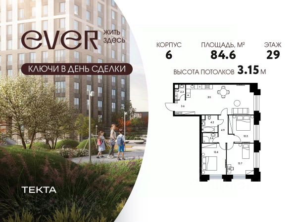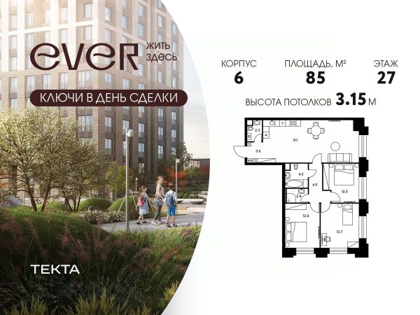 Рассрочка 0% с платежом от 120 000 ₽ в месяц. 4-комн. квартира в ЖК "Ever" на 24 этаже в 34 этажном здании Корпус 4. Общая площадь: 95.3 кв.м., жилая: 59.1 кв.м. Высота потолков 3.15 м. ЖК EVER это современный жилой комплекс в районе Обручева, всего в 7 минутах ходьбы от метро Калужская. В ЖК EVER представлены комфортабельные квартиры с разнообразными планировками, включая редкие форматы с мастер-спальнями и зимними садами. Благоустроенная территория с акцентом на природные элементы создает атмосферу спокойствия и уюта. В комплексе есть подземный паркинг и кладовые помещения. EVER это сочетание комфорта городской жизни и близости к природе.
