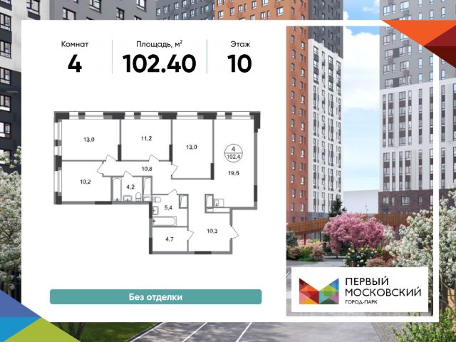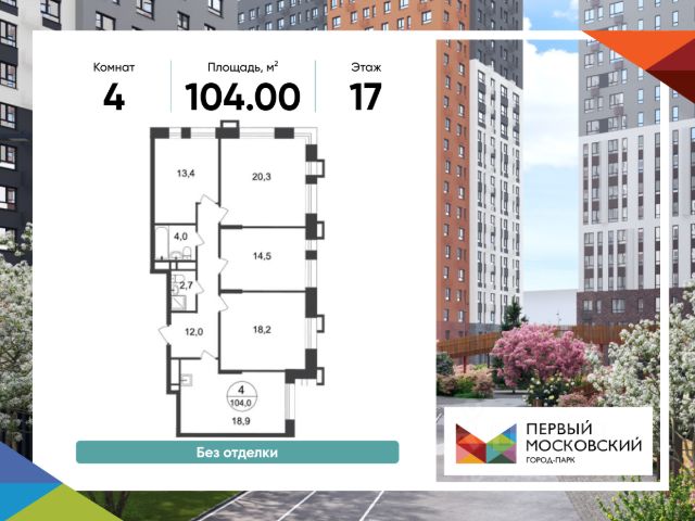 Продается четырехкомнатная квартира без отделки в 7 фазе города-парка "Первый Московский". Общая площадь квартиры - 102,4 кв. м, этаж 3 из 20. Срок сдачи - 1 квартал 2027 года. Тип дома - монолитный. Цена указана при 100% оплате. Новый корпус состоит из 3 секций: - 1 и 2 секции - с отделкой White Box с возможностью приобретения чистовой отделки за дополнительную плату - 3 секция - без отделки Город-парк "Первый Московский" расположен всего в 7 км по Киевскому шоссе (Новая Москва). Из города-парка прямой выезд на Киевское шоссе и трассу Солнцево-Бутово-Варшавское шоссе. ТРАНСПОРТНАЯ ДОСТУПНОСТЬ: - 5 мин. на личном автомобиле или 10 мин. на автобусе 189 и 147 до станции метро "Филатов Луг" - 25 мин. пешком до станции метро "Филатов Луг" ИНФРАСТРУКТУРА: Около 7 фазы запланировано строительство детского сада, школы, 2 многоуровневых паркингов. Также на территории проекта есть все необходимые объекты действующей социальной и бытовой инфраструктуры: 8 детских садов, 5 школ, ТЦ, магазины, паркинги, аптеки и др. БЛАГОУСТРОЙСТВО: - Дворы без машин - Игровые зоны для детей, зоны для занятия спортом, зоны для отдыха с навесами/качелями - Детские площадки разделены по возрастным группам - Пешеходный и веломаршрут с двухполосной велодорожкой 2,5 м в ширину - Озеленение с растениями всесезонного цветения ОСОБЕННОСТИ АРХИТЕКТУРЫ: В каждой секции 3 корпуса предусмотрены: - колясочные во входных группах - кладовые помещения с -1 по 20 этажи - коммерческие помещения на 1 этажах - по 4 лифта: 2 пассажирских, 2 грузовых - видеонаблюдение, установленное в холлах первых этажей, у подъездов и на прилегающей территории АВТОРСКИЙ ДИЗАЙН: Входные группы выполнены по авторскому дизайну, оснащены системой "тёплый пол". В каждой входной группе будет располагаться комфортабельная зона ожидания с мягким диваном, акцентными пуфами и столиком. Продается 4-комнатная квартира в ЖК Город-парк Первый Московский в Москве.