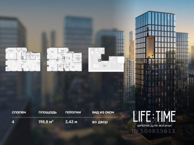 Просторный светлый пентхаус площадью 223,8 кв. м с террасой (73 кв. м). Кухня-гостиная обращена окнами в сторону парка "Красногвардейские пруды" и во внутренний двор-парк, а панорамные окна улучшают видовые характеристики пентхауса. В гостиной можно установить дровяной камин, создающий уютную атмосферу загородного пространства. Продуманная планировка позволяет разместить три приватные спальные комнаты с отдельными гардеробными и санузлами, в одном из которых предусмотрено окно. Life Time - роскошный современный квартал на Пресне, в наиболее быстро растущем премиальном районе ЦАО. Его насыщенная инфраструктура и выгодное расположение дарят время для жизни. Вы больше не тратите его на дорогу или ожидание, при этом ни в чём себе не отказывая. На территории предусмотрено всё для комфортной жизни: • двор-парк площадью 1,8 гектара с прудом и фонтанами; • Clubhouse - инфраструктурный центр в отдельном здании с исчерпывающими возможностями для спорта, отдыха и досуга только для жителей; • спортивная инфраструктура на улице и в помещении, в том числе бассейн длиной 25 метров, хот-таб, хаммам, сауна, бьюти-зона; • клубная гостиная с террасой; • всё для развития и досуга детей любого возраста, в том числе детский сад и школа. Life Time находится в центре сложившегося премиального района, в окружении многочисленных парков. Удобная транспортная доступность и прямой выезд на Звенигородское шоссе позволяют без проблем добраться до Садового кольца и Москва-Сити. Архитектурный стиль квартала - роскошный минимализм. Дома десятилетиями будут выглядеть современно. В Life Time представлен широкий выбор как квартир, так и особых форматов: двухэтажные пентхаусы с каминами и террасами, скай-виллы.