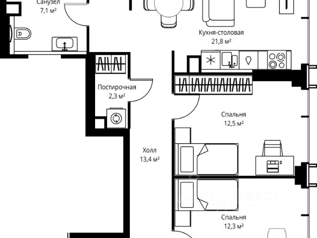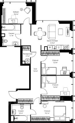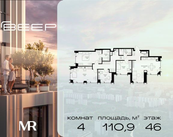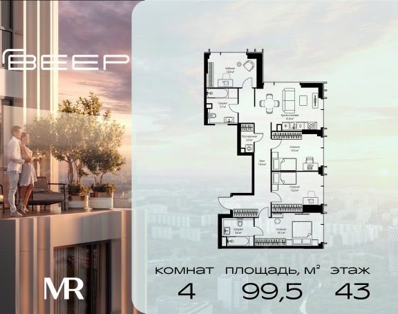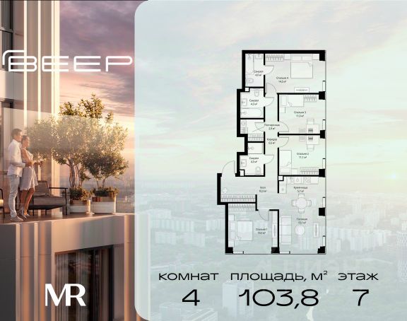 Прямая продажа от застройщика. Продаётся 4-комнатная квартира общей площадью 107.10 м² с предчистовой отделкой в ЖК Веер на 7-м этаже 22 этажного дома. Жилой комплекс бизнес-класса Веер от компании MR — это футуристичный мультиквартал, расположенный в престижной локации на западе Москвы. Благодаря переменной высоте башен — двух 22-этажных, 46-этажной и двух 59-этажных — возникает динамичность в силуэте комплекса, а его яркий образ вносит разноплановость в архитектурный пейзаж района. Расположение и транспортная доступность: • Веер удобно расположен в непосредственной близости от Кутузовского проспекта, обеспечивая быстрый доступ к центральным районам Москвы • Комплекс находится непосредственно напротив самого большого природного заказника в Москве - парка "Долина реки Сетунь", а за семь минут можно доехать до памятника садово-паркового искусства, Троекуровского леса. • Всего в 15 минутах - центр города, самая престижная бизнес-школа управления России "Сколково", дом творчества "Переделкино". Инфраструктура: Разнообразить свой день резиденты Веер смогут также проводя больше времени на свежем воздухе. Двор разделен на 4 зоны разных эмоций и действий, которые пересечены и соединены веерными прогулочными маршрутами: • Спортивная площадка устроена в глубине "Кленовой рощи" • В "Чайном домике" будет создан навес с утеплением для отдыха в любую погоду • Площадки для детей воплотятся в "Волшебный лес" с цветами, зеркалами и световым дизайном • "Центральная площадь" устроена у водного оазиса живописного пруда. Компания MR предлагает своим клиентам специальные условия приобретения квартир в рамках программ ипотечного кредитования от банков-партнеров.