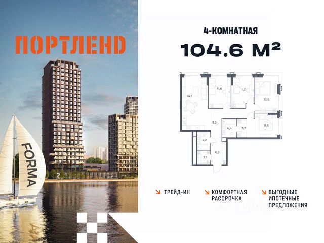 Цены указаны с условием 100% оплаты и стандартной ипотеки. Продаётся 4-к. квартира, 15 этаж в жилом комплексе бизнес-класса ПОРТЛЕНД от девелопера FORMA. ЖК расположен на берегу Москвы-реки в северной части района Печатники в акватории Южного речного порта. Основные преимущества проекта: • Самая протяженная береговая линия реки в Москве 13 км. • Вид на реку в сторону запада панорамные окна на самое широкое водное пространство Москва-реки (900 м) и на закат. • 95% квартир с видом на воду. • К ПОРТЛЕНД не примыкает крупных автомагистралей - отсутствие фонового шума дорог. • В перспективе ближайших 11 лет на территории района запланировано грандиозное преобразование и комплексное развитие. • Собственная набережная длиной 412 м., которая после завершения строительства сомкнется с эко-парком Печатники. • Прямой выход к воде и отсутствие проезжей части между ПОРТЛЕНД и береговой линией. • Инфраструктурное разнообразие: супермаркеты, крупные торговые центры, рестораны, кафе, фитнес-клубы, бьюти-салоны, компании сферы услуг и многое другое. • Собственная школа на 300 мест и детский сад на 275 мест. • Паркинг на 650 м/м • Транспортная вседоступность: метро, авто, велосипед, речной трамвай, канатная дорога • 15 мин. пешком до м. Печатники, 15 мин. на авто до ТТК, 20 минут на авто до Садового кольца