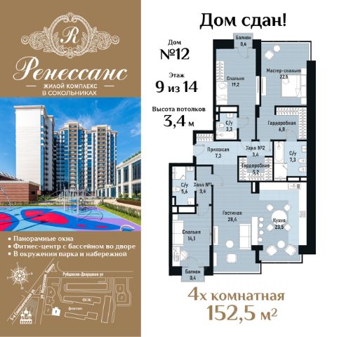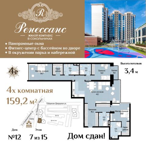 Жилой комплекс премиум-класса "Ренессанс" расположен на Рубцовско-Дворцовой улице старинного района Сокольники, в нескольких минутах ходьбы от знаменитого парка "Сокольники" - самого большого парка Москвы и одного из крупнейших в Европе, где круглый год можно прекрасно проводить время всей семьей. Из панорамных окон премиального бренда Schuco открываются завораживающие виды на сияющие в лучах солнца купола церквей и храмов, изумрудную зелень легендарного парка "Сокольники" и национального парка "Лосиный остров", излучины реки Яузы с величественной гранитной набережной, старинные здания, среди которых дворец императрицы Елизаветы Петровны, небоскребы "Москва-Сити", Останкинскую телебашню и приватную, охраняемую территорию комплекса с концепцией "двор без машин", изысканным ландшафтным дизайном, богатой коллекцией растений, пространствами для отдыха с роскошным фонтаном с красивой подсветкой, элегантной перголой, большими шахматами, детскими городками и спортивными площадками. Роскошный интерьер лобби: натуральный испанский мрамор, вертикальный фонтан, репродукции картин эпохи Возрождения, великолепная итальянская люстра ручной работы с подвесками из хрусталя CutCrystal и муранского стекла, иранские ковры и дизайнерская мебель. Лифты премиум-класса ThyssenKrupp. Консьерж-сервис. На этажах мусорокамеры закрытого типа. Из квартиры можно связаться с консьержем по видеодомофону британской компании BAS-IP. Уникальная транспортная доступность: 5 мин. на авто - до ТТК и Русаковской эстакады; 10 мин. - до Садового кольца и улицы Земляной Вал; 15 мин. - до Кремлевской набережной. В шаговой доступности - ст. м. и БКЛ "Сокольники" и "Электрозаводская". Развитая собственная инфраструктура: подземный паркинг, здание фитнес-центра с бассейнами, объекты торговли и сферы услуг. Отличная инфраструктура респектабельного района Сокольники: детские сады, элитные общеобразовательные, музыкальные и спортивные школы, ТЦ, рестораны, банки.