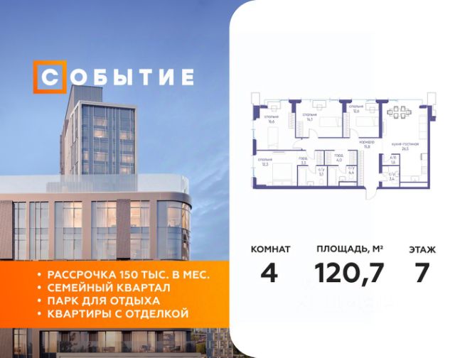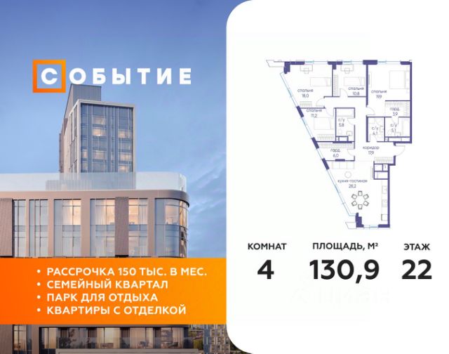 В продаже 4-к квартира от застройщика. Общая площадь 132.80, жилая 60.80, кухня 24.5. Квартира расположена на 12 этаже жилого квартала "Событие-6", корпус 2, 1. Квартира без отделки. Срок сдачи: 4 кв. 2029 года. СОБЫТИЕ.6 — финальный дом парк-квартала СОБЫТИЕ на Мосфильмовской. Переезжайте в уже сформированный квартал с готовой инфраструктурой и парком! Премиальный жилой комплекс в престижном районе Москвы предлагает стильную архитектуру, продуманное благоустройство и великолепно разнообразие общественных пространств. Свой парк прямо возле дома! Архитектура Архитектура СОБЫТИЯ.6 выполнена в ультрасовременном стиле московским бюро Atrium на основе дизайн-кода британских архитекторов LDA Design и UHA London. Дом отличает оригинальная геометрия фасадов, большое остекление и высокие лобби (до 6,2 м) с авторской мебелью и светильниками. Расположение Мосфильмовская улица (Раменки) — один из престижных районов Москвы. Близость к историческому и деловому центру, природным зонам Запада столицы. Транспортная доступность: • 10 мин до Москва-Сити и ТТК; • 15 мин до Садового кольца; • 25 мин до аэропорта Внуково; • 7-10 мин до станций метро "Аминьевская" и "Мичуринский проспект". Инфраструктура: • парк "Событие" (12 га, финалист конкурса Правительства Москвы) с беговыми (1,5 км) и велодорожками (2,7 км), экотропой (1,6 км), площадками, лекторием; • школа, детский сад, магазины, салоны красоты, рестораны (к моменту заселения); • мультидвор с игровыми и спортивными площадками, мини-бульваром; • общественная терраса на 10-м этаже (коворкинг, лаунж); • Закрытые общественные пространства: детская комната, спортивный зал, коворкинг, лаунж-зоны. Паркинг 256 мест для жителей (48 — для электромобилей), 24 гостевых (5 — для электромобилей), мойки колес, кладовые, зоны для велосипедов. Окружение Парки и заповедники (Воробьёвы горы, Матвеевский лес и др.), МГУ, театр им. Н. И. Сац, стадион "Лужники". Безопасность Видеонаблюдение, контроль доступа, видеодомофоны, консьерж-сервис 24/7, системы пожарной безопасности и мультисервисная оптическая сеть. 4-комнатная квартира 4-комнатных квартир в Событие в Москве.