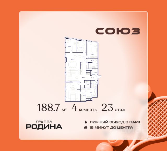 Рассрочка 0% Продаётся 4-комнатная квартира площадью 128 м² на 12 этаже в Жилом Комплексе "Союз". Квартал здоровой жизни премиум-класса с рекордным количеством олимпийских видов спорта: - Ледовая арена для хоккея и фигурного катания, - Футбольные поля для тренировок, - Спортивный зал для фехтования, - Бассейн на 6 дорожек, - Центр единоборств, - 4 крытых площадки для настольного тенниса, - 7 теннисных кортов (крытых и открытых), - 4 крытых площадки для сквоша, - Легкоатлетический стадион, - Площадки для баскетбола и волейбола. Уникальные форматы квартир с мастер-спальнями, приватными террасами, балконами, а также пентхаусы с открыточными видами на город. Все квартиры продаются с отделкой Shell&Core и панорамным остеклением. Расположение Пешком: - 2 мин. до парка "Сад Будущего"; - 6 мин. до ст. м. "Ботанический сад"; - 6 мин. до ст. МЦК "Ботанический сад"; - 6 мин. до парка "Леоновская роща"; На автомобиле: - 2 мин. до СВХ (МСД); - 5 мин. до Проспекта Мира; - 10 мин. до ТТК; - 15 мин. до Садового кольца; - 25 мин. до аэропорта "Шереметьево". Благоустройство - собственная спортивная инфраструктура 7 Га; - зона для пикников; - игровые и спортивные площадки для детей всех возрастов; - розарий, а также сосновые, каштановые и дубовые аллеи; - площадки под открытым небом для занятий спортом и йоги; - игровые комнаты для детей; - лаунж-зона для резидентов; - просторная переговорная для деловых встреч; - премиальный ресторан "Шабада" Сосо Павлиашвили с водными арт-объектами на прогулочной аллее, садом ароматных трав и сценой под открытым небом; - кафе, химчистки, аптеки и супермаркеты рядом с домом. Окружение - 8 парков: Сад Будущего, Леоновская роща, Хуамин, Главный ботанический сад РАН, Шереметьевская дубрава, Останкино, парк спорта "Яуза", пойма реки Яуза и музей-усадьба "Останкино"; - 3 ВУЗа: ВГИК, РГСУ, МГПУ; - 12 школ, в том числе: школа 1499 им. И.А. Докукина (топ 100), Brookes Moscow, IThub школа; - 18 детских садов, в том числе билингвальный ALERTUM KIDS; - один из крупнейших океанариумов Европы "Москвариум"; - один из крупнейших в Европе торгово-развлекательных центров "Европолис".