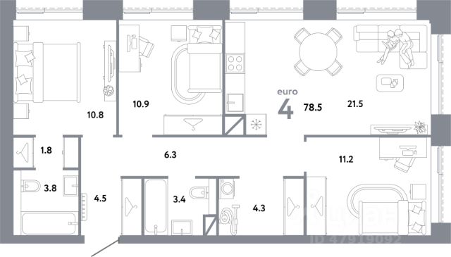 Проектная площадь с учетом лоджии составляет 66.18 м², жилая: комната 1-16,85 м², комната 2-15,98 м², лоджия- 3,90 м².