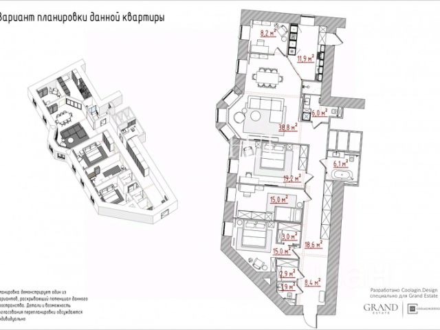 Планировка включает в себя: 3 спальни (с возможностью увеличения до 5, за счет антресолей), 4 с/у, гостиная, столовая, библиотека, кухня, постирочная/гладильная, 23 гардеробные, подсобное помещение.
