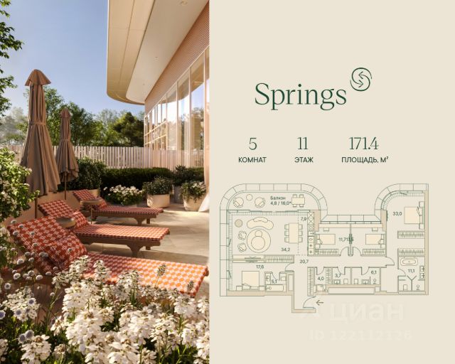 Пятикомнатная велнес-резиденция площадью 173.4 кв. м. на 20 этаже с видом на парк и центр в доме премиум-класса Springs. В квартире выполнена чистовая дизайнерская отделка. Резиденция наполнена светом и воздухом, благодаря панорамному остеклению и высоким потолкам. На первом этаже дома расположены: - фитнес-центр с бассейном; - СПА с хаммамом; - бьюти-зона с массажным кабинетом. - ресторан. Все сервисы доступны исключительно для резидентов. Всего в 2 минутах ходьбы от дома находится заповедный парк Фили прекрасное место для спокойного и активного отдыха. Зеленый массив, набережная, велотропы и открытые зоны для йоги, а также шахматный клуб, летний кинотеатр, множество беседок и кофеен. До делового комплекса Москва-Сити всего 16 минут, а центр — в 14 минутах езды по Кутузовскому проспекту. Удобный выезд к Рублёвскому шоссе — отличная возможность на выходных сбежать с детьми за город, потратив на дорогу меньше получаса. Концепция благоустройства Springs, разработанная студией Wowhaus, воплощает идею взаимного проникновения парка и озеленения внутренней территории: естественная растительность, дополненная акцентами из цветников, плавно вступает во двор. В сочетании с бионической архитектурой дом является органичным продолжением природного ландшафта парка.