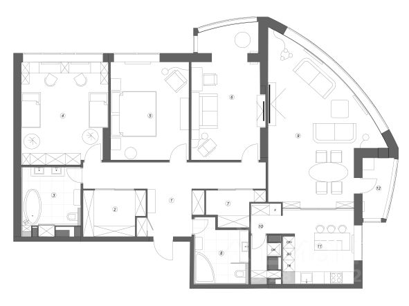 Общая площадь квартиры - 144,5 кв.м., жилая площадь - 75,1 кв.м. (2 изолированные спальни 13,9 кв.м. и 14 кв.м., 2 гостиные 18,9 кв.м. и 19,8 кв.м., и кабинет), просторная кухня-столовая - 19,5 кв.м., полнофункциональный гостевой санузел, основной санузел - 16,6 кв.м., гардеробная комната - 7,8 кв.м., много вместительных встроенных шкафов для хранения. 3 теплые лоджии (дополнительно к площади квартиры). 6 окон на юго-восток, 2 окна на запад.
