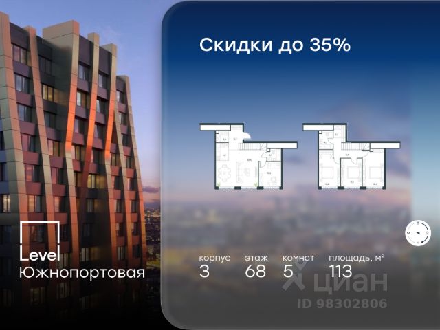 Цена указана с учётом скидки при 100%-й оплате, несубсидированной ипотеке, рассрочке (кроме программы "Рассрочка 0%"). В северной части района Печатники продается многокомнатная квартира площадью 108.50 кв.м без отделки. Квартира расположена на 68 этаже 69-этажного корпуса 1 в жилом комплексе комфорт-класса Level Южнопортовая (компания Level Group/Левел групп). Отличная транспортная доступность: - 10 мин. пешком до станции метро "Кожуховская"; - 20 мин. пешком до станции МЦК "Дубровка"; - 3 мин. на авто до ТТК; - 13 мин. на авто до Садового кольца; - 15 мин. на авто до Бульварного кольца. Продуманный архитектурный проект: - авторская архитектура от бюро СПИЧ; - уникальные виды на реку, парки и достопримечательности города; - высота потолков в квартирах до 6 м; - окна высотой до 1,87 м с высоким коэффициентом сопротивления теплоотдаче. Расположение: Level Южнопортовая строится в северной части района Печатники - самой приближенной к центру. Здесь будет сформирован новый район "Южный порт", где построят крупный жилой и общественно-деловой центр, аналогичный Москва-Сити. В течение 10-12 лет в этом месте появятся не только жилые дома, но и развитая инфраструктура для жизни и работы. А еще совсем рядом находится набережная Москвы-реки, где планируется построить причалы для речных трамвайчиков и канатную дорогу. Уже сейчас вокруг жилого комплекса работают десятки магазинов и торговых центров, рядом расположено 6 парков, среди которых музей-заповедник "Коломенское". В 10 минутах пешком - 2 муниципальных и 2 частных детских сада, 7 общеобразовательных школ. Внутренняя инфраструктура: Для отдыха жителей в каждом корпусе предусмотрено лобби, оснащенное местами для отдыха, гостевыми санузлами и лапомойками, а в отдельных корпусах - камином. За счёт больших окон и высоких потолков пространства будут наполнены воздухом и светом. На первых этажах жилого комплекса откроются магазины, салоны красоты, фитнес-центр. Для детей строятся собственные детский сад и школа. Благоустройство: Внутренний двор комплекса разработан совместно с бюро GAFA. Основная идея - создать аналог Центрального парка в Нью-Йорке, гармонично сочетая высотные здания и большое изолированное парковое пространство. Вся площадь двора-парка будет огорожена и составит более 2 га, из которых 45% - озеленение. Одним из самых важных ландшафтных элементов здесь станет небольшая речка, наполняющаяся во время дождя. Вокруг неё появится сеть из островов, внутри которых расположатся тематические зоны спорта и отдыха. Технологии и инженерия: - автоматическая передача в управляющую компанию показаний квартирных счётчиков; - телефонная связь, телевидение и интернет на базе оптической мультисервисной сети; - гостевой Wi-Fi в лобби и на территории двора; - единый ключ доступа для входа на территорию комплекса. Продается элитная 5-комнатная квартира, жильё станция Дубровка (МЦК).