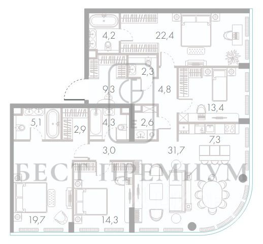 Покупателю остаются: мебель и сантехника в с/узлах, встроенная мебель в комнатах, кондиционеры, итальянский кухонный гарнитур Verona, немецкие встроенный холодильник, посудомоечная машина, варочная поверхность, духовка-пароварка, вытяжка (Neff) стиральная и сушильная машины (Miele), СВЧ-печь.