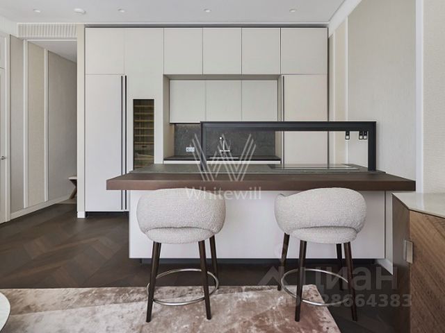 Комнаты обставлены мебелью премиальных брендов: Minotti, Poltrona Frau, Poliform, Rimadezio. Кухня из натурального шпона укомплектована бытовой техникой Miele и VZUG. Ванные комнаты оснащены сантехникой и мебелью Gessi, Antonio Lupi, Arby.