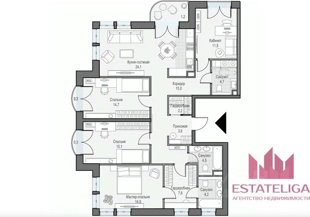 Продается пентхаус площадью 168,6 м² в башне "Гармония" клубного дома "Кутузов Сити". Это по-настоящему эксклюзивное предложение в одном из самых престижных районов Москвы. Пентхаус занимает весь этаж и отличается продуманной изысканной планировкой, которая органично разделяет приватные и общественные зоны. Просторная гостиная объединена с кухней-столовой. Вместе они образуют открытое пространство для общения и уютных вечеров в кругу семьи и друзей. Благодаря большим панорамным окнам из каждой комнаты открываются великолепные виды на парк и город, а выход на две собственные террасы позволяет наслаждаться свежим воздухом и создавать свои индивидуальные зоны отдыха — будь то семейные ужины летом или утренний кофе на рассвете. В приватной части квартиры расположены три изолированные спальни спальни. Одна из них — мастер-спальня с собственной ванной комнатой и просторной гардеробной — здесь вы по-настоящему можете уединиться и расслабиться. Особое внимание уделено деталям: высокие потолки усиливают ощущение свободы, эркеры и угловые окна подчеркивают индивидуальность интерьера. Входная зона дополнена санузлом, ванной и хозяйственным помещением. Клубная атмосфера самого дома, закрытая территория и стильные лобби создают ощущение особого статуса и безопасности, а соседство с природным заказником "Долина реки Сетунь" позволяет ежедневно наслаждаться близостью природы, не покидая сердца города. Тишина, приватность и возможность воплотить уникальные интерьерные решения — несомненные преимущества единственного пентхауса в башне "Гармония". Этот пентхаус станет для вас не просто местом для жизни — а настоящим домом, где каждая деталь подчеркивает ваше стремление к совершенству и умение ценить лучшие стороны городской жизни. О проекте: "Кутузов Сити" — клубный дом на 220 квартир, разработанный совместно с бюро Atrium и Oleg Klodt Architecture & Design. Проект строится в престижном Западном административном округе Москвы, всего в нескольких минутах ходьбы от Кутузовского проспекта. Закрытая территория, приватный двор, подземный паркинг и стильные лобби создают атмосферу комфорта и безопасности. В двух шагах от дома находится крупнейшая природная территория Москвы — природный заказник "Долина реки Сетунь". Камерная застройка и развитая инфраструктура делают "Кутузов Сити" отличным выбором для тех, кто ценит качество жизни и близость к природе. (Лот: 45)