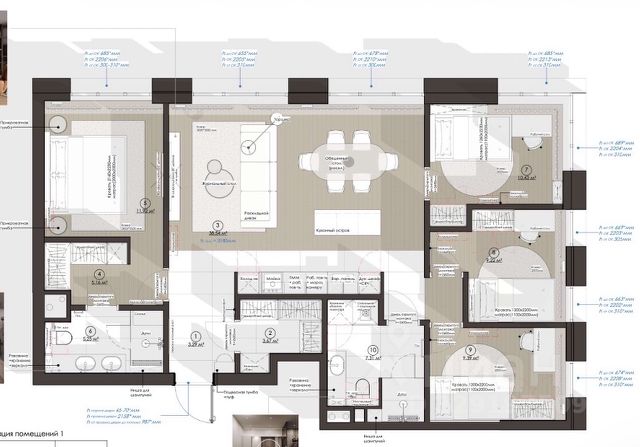 - кухня-столовая для всех жильцов + большая гостиная со впечатляющим метражом по площади;