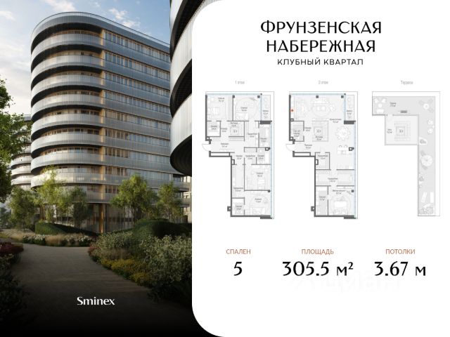 Роскошный двухэтажный пентхаус с собственной террасой на крыше. Площадь позволяет с комфортом разместить 5 спален, одна из которых будет иметь светлую гардеробную и ванную комнату с панорамными окнами. Кухня-гостиная с камином, балконом и потрясающими видами станет точкой притяжения для всей семьи. Сценарии времяпрепровождения и отдыха на просторной террасе разнообразны: обеденная зона, лаундж-пространство, шезлонги для принятия солнечных ванн и даже джакузи. "Фрунзенская набережная" - единственный элитный клубный квартал на престижной и желанной Фрунзенской набережной, где нет и не появится новых домов такого класса. Для его жителей создан собственный просторный витражный парк площадью 3,1 гектара, где царит атмосфера загородной тишины и безмятежности. Это самый большой в элитном классе парк - он занимает 70% всей территории. Клубные дома скрыты от посторонних глаз и шума мегаполиса обильной зеленью и окружены парадной сталинской застройкой. Расположение идеально подходит для любителей прогулок и здорового образа жизни. Для жителей доступен прямой выход к Москве-реке, за которой раскинулись парк Горького, Нескучный сад и Воробьёвы горы - всего 219 гектаров природных парков. На набережной маршруты для бега, пеших и велопрогулок. Спортивный комплекс "Лужники" расположен в 2 километрах. В уникальном клубном квартале создана беспрецедентно масштабная среда для жизни, деловых и личных знакомств, воспитания и игр детей среди равных по статусу соседей в культовом месте и окружении. На его территории сформирована впечатляющая по масштабам и насыщенности инфраструктура только для жителей общей площадью 2700 кв. м. Для максимального комфорта территория своего парка разделена на зоны активного и спокойного отдыха. На свежем воздухе для маленьких жителей разных возрастов оборудована самая большая в элитном классе детская игровая площадка (600 кв. м) по стандарту Kids Lab. Для активного отдыха создана уникальная среди элитных домов многофункциональная площадка (368 кв. м) для футбола, бадминтона, баскетбола, волейбола и других командных видов спорта, также предусмотрена зона для воркаута площадью более 100 кв. м. Для спокойного досуга на природе в своём парке созданы пейзажный пруд с витражным навесом и террасой, тихие зоны у воды, оазисы комфорта - зелёные комнаты с мягкой мебелью и шезлонгами. Парк располагает к прогулкам, в нём много маршрутов вокруг арт-объектов, есть пряный сад с ароматными травами. Здесь можно устроить семейный пикник, почитать книгу в тени деревьев и забыть о том, что живёте в центре города, подарив себе полноценный отдых на природе. В клубном квартале только для жителей создан беспрецедентно большой в элит-классе инфраструктурный центр - Clubhouse. Он расположен в отдельном здании и формирует атмосферу закрытого камерного клуба для своих, где каждый найдёт себе занятие по душе. В Clubhouse комплексная и разнообразная инфраструктура, которая создана по фирменным стандартам Sminex и объединяет лучшие возможности для общения и от
