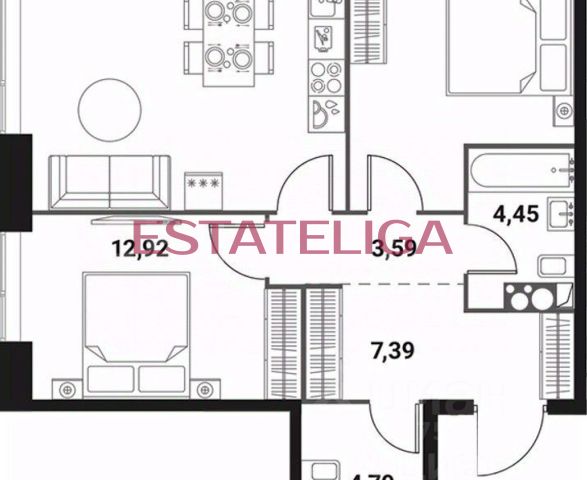2 большие спальни (20 и 23 м²), 2 санузла, кухня, лоджия (8,5 м²), гардеробная (4,84 м² ), просторный коридор.