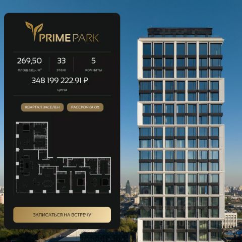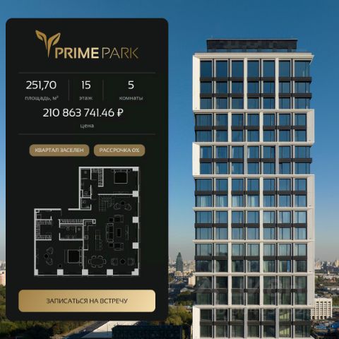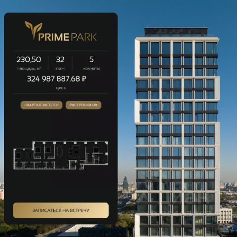 Жилой квартал Prime Park воплощает все преимущества premium-living. Престижная локация на Ленинградском проспекте, 37: - 5 мин. от Тверской улицы, Патриарших прудов и Белой площади, - 20 мин. до аэропорта "Шереметьево" или "Москва-Сити", - 4 парка — Ходынское поле, Петровский и Чапаевский парки, Березовая роща, - 4 станции метро — "ЦСКА", "Аэропорт", "Динамо" и "Петровский парк". Многократный победитель премий European Property Awards и Urban Awards, а также на протяжении пяти лет остается самым продаваемым проектом в своем сегменте. Premium-living Консьержи предугадывают желания резидентов и берут на себя выполнение практически любых бытовых задач. В квартале также есть парк-рейнджер и охрана. Для дополнительного удобства в МОПах предусмотрены почтовые комнаты, колясочные и комнаты для мытья лап домашних питомцев, комната для хранения интернет-заказов. Наличие сервисного входа для персонала позволяет разделить трафик, сохраняя приватную атмосферу в лобби. Резидентам нужно открыть только одну дверь, чтобы оказаться дома: valet-парковщики открывают дверь автомобиля и отвозят его на подземный паркинг, беллмены открывают двери при входе в башню и помогают донести вещи до квартиры, интеллектуальная система обеспечивает бесконтактный вызов лифта. Развитая инфраструктура Близость к центру Москвы, рядом крупнейший ТЦ "Авиапарк", ВТБ Арена, Мегаспорт, ВЭБ Арена, в окружении красивейших парков, включая ультрасовременный Ходынский парк площадью 25 га с панорамными качелями, набережной, фонтанами, детскими и спортивными площадками. На территории квартала предусмотрены приватный фитнес-центр с 25-метровым бассейном и спа, подземный паркинг с кладовыми, местами для хранения велосипедов, электрозарядками и детейлинг-центром для обслуживания автомобилей. На первых этажах башен расположатся кафе и рестораны, цветочный магазин, аптека, салон красоты, премиальный супермаркет и бытовые сервисы. Частный парк Общее парковое пространство квартала — 5,5 га, из них 3 га отведено под частный парк эксклюзивно для резидентов. Большой фонтан, аллеи для прогулок, крупномерные деревья, арт-инсталляции, водные глади, детские площадки и воркаут-зона создают гармоничное сочетание жизни на природе со всеми преимуществами мегаполиса. Уникальная квартирография Более 80 вариантов планировочных решений от однокомнатных квартир до двухуровневых дуплексов и пентхаусов. Панорамные окна, высокие потолки, мастер-спальни, балконы и террасы создают особенный комфорт и уют. Авторская архитектура и дизайн Четыре башни сданы, ключи выдаются в день сделки, 2 башни на этапе строительства, сдача в 2023 и 2024 гг. Уникальный архитектурный ансамбль и ландшафтный дизайн, благородные и ценные материалы в оформлении лобби, предметы искусства, арт-объекты и элементы декора, выполненные на заказ специально для Prime Park, становятся отражением яркой индивидуальности резидентов квартала. 5-комнатная квартира рядом с метро Динамо.