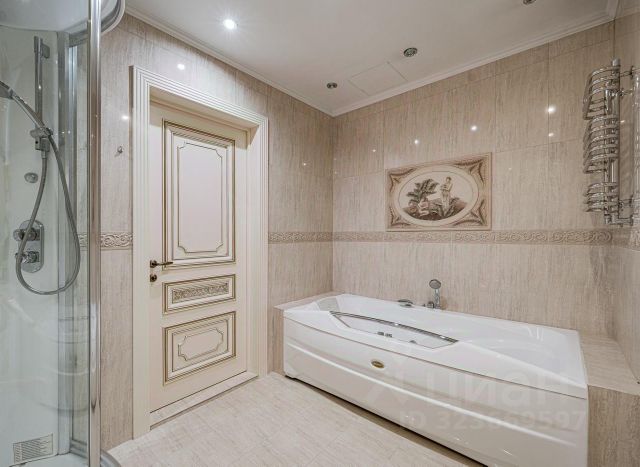 В санузле: шкаф из натурального дуба с местом под стиральную машину. Столешница из искусственного камня с врезной мойкой. Встроенная душевая система с потолочной лейкой Hansgrohe, гигиенический душ. Раздвижное душевое ограждение Gutewetter. Унитаз Laufen с инсталляцией. Электрический полотенцесушитель. Встроенный шкаф с местом под хоз блок.