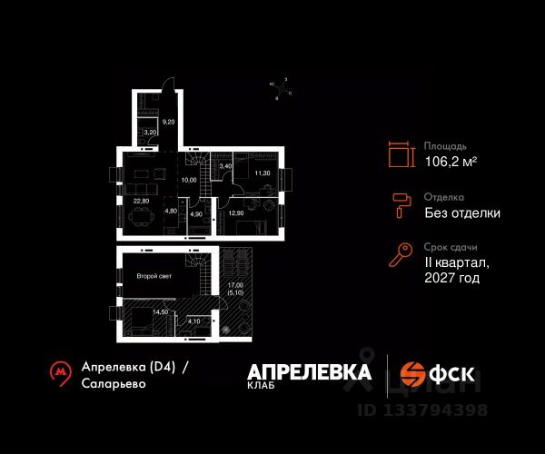 Прямая продажа от застройщика! Загородный жилой комплекс класса Комфорт Плюс. Продаётся 5-к квартира 124 общей площадью 106.2 кв.м на 5-м этаже 5 этажного дома. Без отделки. Расположение комплекса: "Апрелевка Клаб" это жилой комплекс всего в 30 км от Москвы по Киевскому шоссе, где городские удобства гармонично сочетаются с природой. Здесь начинается новая ступень жизни: современная малоэтажная застройка не нарушает живописные виды, а закрытая территория дарит чувство безопасности. Особенности проекта: - Улучшенная отделка МОПов - Социальная инфраструктура в шаговой доступности: муниципальные детский сад и школа, поликлиника - Не просто школа: школа МГИМО - Школа искусств МАРХИ - Всесезонное уникальное благоустройство: от города к природе через призму искусства - Комфортное пространство (спорт, досуг с детьми, работа в удаленном формате с прекрасными видами, место для творчества, тихие места для уединения и размышления) - Отличная транспортная доступность Транспортная доступность: - Метро Филатов Луг и Рассказовка 25 км - МЦД Апрелевка 5 км - МКАД — 30 км - Садовое кольцо — 45 км - Метро в Троицке (открытие в 2030) — 22 км - Ближайшая остановка общ. транспорта "Фрунзевец" 550 м - Ст. м. "Саларьево" 30 мин. на автобусе Внутренняя инфраструктура: Здесь есть хобби на любой вкус, возраст и сезон. Велосипедные, беговые и прогулочные маршруты, уличный workout, летний амфитеатр, спортивная площадка, центральная площадь с сухим фонтаном и игровыми зонами. Крытые развлечения: зона коворкинга, детская комната, кафе. В жилом комплексе будет современная школа на 830 мест и детский сад на 400 мест нового формата: с просторными классами и современным оснащением согласно высоким стандартам. Также на территории будет размещена школа искусств. Дворы без машин, игровые зоны и маршруты для прогулок с навигацией минимизируют риски и создают ощущение защищенности. Вдоль южной границы комплекса протекает река Десна, создавая зону отдыха в природном окружении.