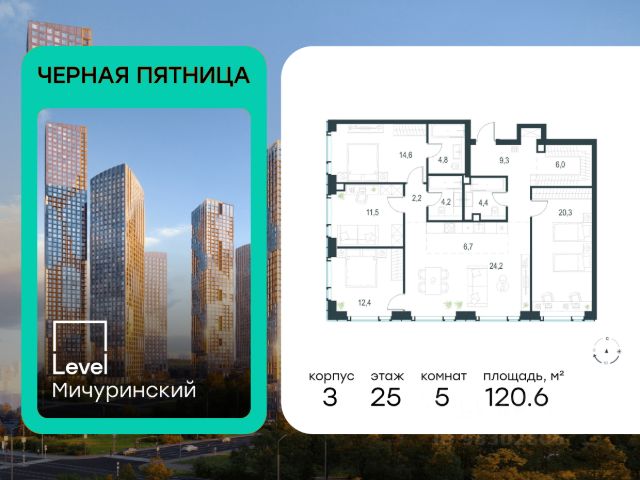 Цена указана с учётом скидки В жилом квартале, расположенном на границе с природным заказником "Долина реки Очаковки", продаётся многокомнатная квартира площадью 120.60 кв.м с отделкой white box. Квартира расположена на 25 этаже 30-этажного корпуса Корпус 3 в жилом комплексе бизнес-класса Level Мичуринский (компания Level Group/Левел групп). Отличная транспортная доступность - 10 мин. пешком до станции метро "Мичуринский проспект" - 15 мин. пешком до станции метро "Аминьевская" - 7 мин. на авто до МКАД - 10 мин. на авто до ТТК - 15 мин. на авто до Москва-Сити Продуманный архитектурный проект - Выразительная архитектура от известных бюро: корпуса 1-6 - СПИЧ, корпуса 7-13 - Borisov Architects; - Из окон открываются живописные виды на парки, Москва-Сити и МГУ; - Высокие потолки до 6,35 м; - Стильные лобби с окнами в пол и высокими потолками до 4,7 м; - С каждого этажа дома на лифте можно спуститься в подземный отапливаемый паркинг. Расположение Level Мичуринский строится в одном из самых зеленых районов Москвы - Очаково-Матвеевское. Этот уголок столицы идеален для поддержания здорового образа жизни. В шаговой доступности от проекта находятся заказник "Долина реки Очаковки" - 1 мин. пешком и Очаковский парк - 7 мин. пешком. На велосипеде можно добраться до таких парков, как "Событие", парк Олимпийской деревни, парк 50-летия Октября и парк Школьников. В 15-минутной доступности на авто расположено более 30 детских садов (из них 14 в пешей доступности), 32 школы (из них 13 в пешей доступности) и 14 вузов. В ближайшем окружении работает более 25 медицинских учреждений, 11 спортивных клубов и 22 продуктовых супермаркета. Внутренняя инфраструктура На территории жилого комплекса строится три детских сада и школа. На первых этажах домов откроется супермаркет, фитнес-центр, ресторан, кафе и другие сервисы. Подземные этажи займут паркинги: трехуровневые в этапах 1 и 2, одноуровневый в этапах 3 и 4. Преимущества проекта - 4,5 га благоустроенной территории с видовым мостом, уличным кинотеатром, зонами для тихого отдыха, работы, воркаута, площадки для петанка, футбола, настольного тенниса и пляжного волейбола; - Дизайнерские лобби с панорамным видом на двор, мойками для лап животных и комфортными зонами ожидания. - Безопасность жителей: круглосуточное видеонаблюдение всех зон общего пользования (лобби, лифты, паркинги, детские площадки), система контроля доступа, управление видеодомофоном через мобильное приложение, единый ключ доступа на территорию жилого комплекса. - Технологии и комфорт: высокоскоростной Wi-Fi в лобби и на придомовой территории, автоматическая система контроля и учета ресурсов, абонентская связь с консьержем, распознавание номеров автомобилей при въезде/выезде в/из паркинга. 5-комнатная квартира в районе Очаково-Матвеевское в Москве.