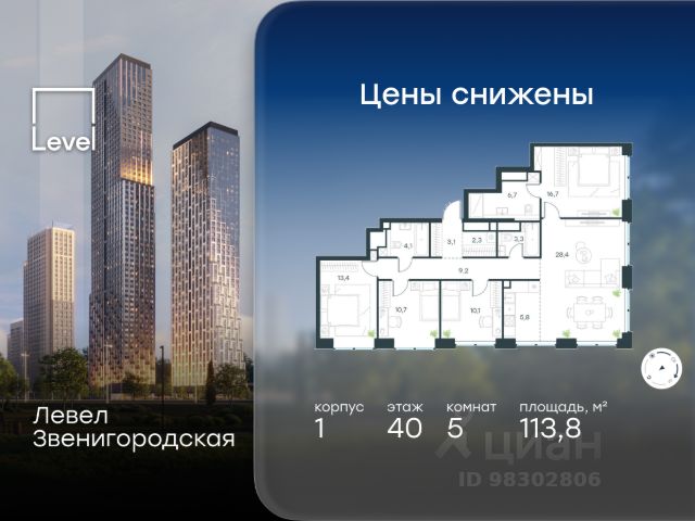 Цена указана с учётом скидки при 100%-й оплате, несубсидированной ипотеке, рассрочке (кроме программы "Рассрочка 0%"). В жилом квартале продаётся многокомнатная квартира площадью 116.80 кв.м с предчистовой отделкой. Квартира расположена на 33 этаже 48 этажного корпуса 1 в жилом комплексе комфорт класса Левел Звенигородская (компания Level Group/Левел групп). Отличная транспортная доступность - 5 мин. пешком до метро "Звенигородская" (откроется к окончанию строительства); - 18 мин. пешком до станции МЦК "Хорошёво" и станции БКЛ "Народное ополчение"; - 4 мин. на авто до ТТК; - 8 мин. на авто до Садового кольца; - 15 мин. на авто до Кремля. Продуманный архитектурный проект - Концепция от студии Станислава Михаловского, в основу которой легло единение природы и города; - Двухкамерные стеклопакеты в окнах, алюминиевый и ПВХ профиль - в квартирах тепло зимой и прохладно летом; - С верхних этажей открываются панорамные виды на город, Москву-реку, "Москва-Сити" и Москворецкий парк; - Лобби со всеми удобствами: окна в пол, высокие потолки до 4,7 м, лаунж-зоны, колясочные, гостевые санузлы и мойки для лап животных; - Централизованные водонагреватели гарантируют круглогодичную подачу горячей воды в каждую квартиру. Благоустройство Концепция благоустройства разработана совместно с бюро UNK landscape. Высота башен приближается к 200 метрам - они словно касаются неба. Небесный простор проецируется на территорию двора с помощью подсветки, визуально увеличивая пространство и отражаясь в авторских элементах архитектуры. На территории площадью 0,45 га расположатся: - "Облако событий" - место встреч и общения; - "Облако спорта" - всё для поддержания себя в форме; - "Облако принятия решений" - пространство для работы на свежем воздухе; - "Облако спокойствия" - для отдыха в тишине природы; - "Облако игр" - площадки для подростков и самых маленьких. Инфраструктура В жилом комплексе откроется 21 коммерческое помещение: продуктовые лавки, кафе, салоны красоты, службы доставки и творческие студии. Этап 1 включает строительство двухуровневого подземного паркинга. Всего здесь расположится 351 машино-место, включая семейные места, и 264 кладовых помещения. В распоряжении жителей развитая инфраструктура района: 15 супермаркетов, 5 спортивных объектов, 9 медучреждений, 7 детских садов, 4 школы, 3 благоустроенных парка - всё в шаговой доступности. Инженерия Комфортное перемещение внутри домов будут обеспечивать надёжные лифты с доступом в паркинг с жилых этажей. В каждом корпусе предусмотрено до шести кабин, включая сервисные лифты. Попасть на территорию комплекса можно только по единому ключу доступа. Видеонаблюдение установлено на входах в подъезды, в лобби, в общих зонах, на въезде в паркинг. Гости смогут связаться с жителями дома через входные видеопанели, а управлять доступом на территорию можно через видеодомофон или приложение на телефоне.