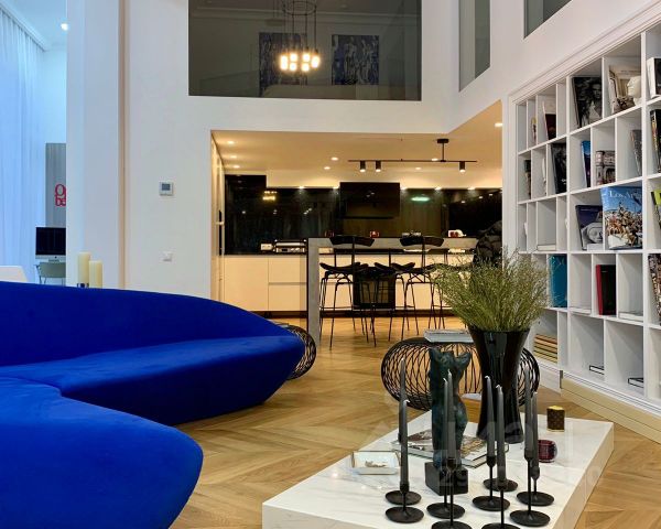 В квартире выполнена премиальная дизайнерская отделка с использованием высококачественных и натуральных материалов, таких как: натуральный мрамор, анодированная бронза, натуральный итальянский шпон, анодированная латунь.