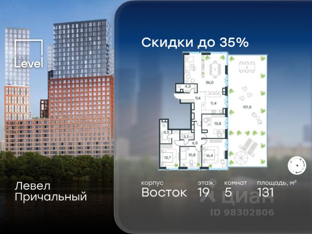 Цена указана с учётом скидки при 100%-й оплате, несубсидированной ипотеке, рассрочке (кроме программы "Рассрочка 0%"). Ключи в момент покупки! Квартира с террасой! В готовом жилом комплексе на набережной Москвы-реки продается многокомнатная квартира площадью 131 кв.м без отделки. Квартира расположена на 19 этаже 33 этажного корпуса " Восток" в жилом комплексе бизнес-класса Левел Причальный (компания Level Group/Левел групп). Возможность купить машино-место в подземном паркинге. Отличная транспортная доступность - 7 мин. пешком до станции метро и МЦК "Шелепиха"; - 5 мин. на авто до ТТК; - 10 мин. на авто до Москва-Сити; - 13 мин. на авто до Садового кольца. Продуманный архитектурный проект - концепция от архитектурного бюро "Остоженка"; - окна высотой до 3,03 м и шириной до 4,3 м; - виды на МГУ, Москва-Сити, высотки на Смоленской и Кудринской площадях; - квартиры сдаются без отделки - отличный вариант для создания уникального интерьера. Технологии и безопасность - система приточной вентиляции обеспечит свежий воздух в квартирах; - собственные центральные водонагреватели - гарантия горячей воды в каждой квартире круглый год; - единый ключ доступа по всей территории ЖК; - высокоскоростные лифты OTIS. Благоустройство Дизайн внутренней территории жилого комплекса Левел Причальный разработан совместно со студией UpLand. Это уникальный двухуровневый двор с пространством для жителей любого возраста. Концепция игрового пространства верхнего яруса - каникулы на морском побережье. Дети постарше будут в восторге от большого скалодрома и песочницы-пляжа площадью 280 м², а для малышей - безопасная площадка с фигурой кита-полосатика по центру. Верхний и нижний уровни двора соединяет 90-метровый мост-пергола. Дети смогут спускаться с него по горкам, будто ныряя в пучину океана. На нижнем уровне всё располагает к размеренному отдыху: прогулкам, беседам, релаксу на шезлонгах, творческим вечерам в амфитеатре или командным активностям с соседями. Все общественные зоны жилого комплекса, включая двор и лобби, имеют доступ к сети Wi-Fi. Внутренняя инфраструктура В жилом комплексе предусмотрен собственный торговый центр, супермаркет, фитнес-зал и другие сервисы. Просторные входные группы с потолками до 4,4 м подчёркивают статусность дома. Для удобства предусмотрены мойки для лап животных, кладовые, гостевые санузлы и теплый подземный паркинг на 694 машино-места. Инфраструктура района Жилой комплекс Левел Причальный расположен в районе Хорошёво-Мнёвники, одном из самых экологически чистых и престижных районов СЗАО Москвы. В 15-минутной доступности на авто - 50 детских садов, 22 школы, 5 торговых центров, десятки супермаркетов и фитнес-клубов. И совсем скоро Шелепихинская набережная, на которой расположен жилой комплекс, приобретет новый облик и станет одним из главных мест притяжения резидентов Левел Причальный.