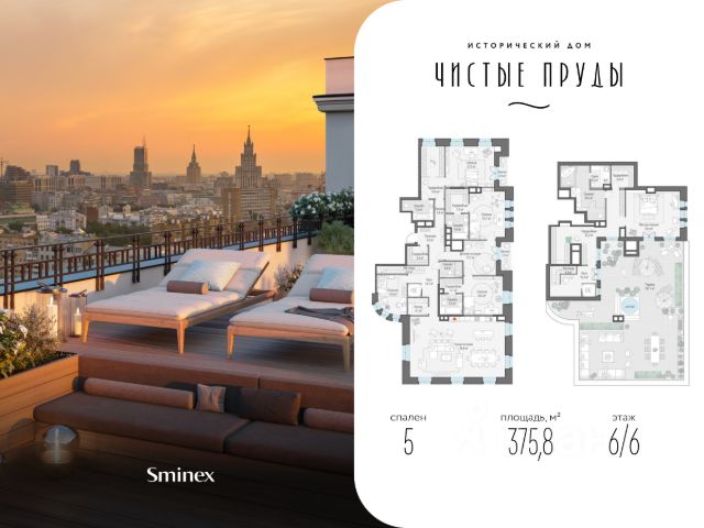 Роскошный пентхаус общей площадью 392,2 кв. м. расположен на 6-м этаже. Арочные окна, элегантный сферический эркер и высокие 4-метровые потолки создают уникальное пространство, наполненное светом. Продуманная и изысканная планировка, в которой разделены общие и приватные зоны позволит всем членам семьи совмещать свои сценарии жизни. Окна пентхауса выходят на все стороны света, дровяной камин в гостиной наполнит зимние вечера теплом и уютом, подчеркнет престиж и статус семьи. Потрескивание дров создает спокойную и романтичную атмосферу в доме. Расположенная на крыше личная терраса площадью 185 кв. м. с неповторимыми видами делает пентхаус идеальным местом для комфортной и по-настоящему роскошной жизни. "Чистые Пруды" - исторический дом на 34 квартиры в уникальном атмосферном районе Москвы, в 50 метрах от Чистых прудов. Это одно из самых романтичных и престижных мест столицы. Дом расположен в глубине квартала, в окружении тихих переулков - в полной тишине и приватности старого московского двора. "Чистые Пруды" - деликатно реконструированный исторический дом с изысканной архитектурой начала прошлого века авторства барона Отто фон Дессина. У дома максимально сохранены архитектурные формы 1915 года и подлинные кирпичные стены. В "Чистых Прудах" создана небывалая для таких домов инфраструктура. Только для жителей на месте каретного двора XIX века расположен Clubhouse с пространствами для общения соседей, здорового образа жизни и развития детей. В Lounge выделены каминная, патио, зона для проведения мастер-классов и настольных игр. Работает бесплатный фитнес по стандарту Fit Lab с зонами кардио, силовых тренажёров, свободных весов и функционального тренинга. Для детей в Clubhouse создана игровая комната по стандарту Kid`s Lab. Есть свой всесезонный двор-сад. В доме представлены роскошные квартиры с дровяными каминами и высокими потолками от 3,9 до 5,4 м. О жителях и доме заботится Служба комфорта Smineх, которая предлагает сервис уровня 5-звёздочных отелей и сохраняет изначальный облик и концепцию дома. Девелопер проекта - Sminex. Компания обладает 23-летним опытом строительства жилой и коммерческой недвижимости. В 2022 году Sminex приобрёл девелопера "Интеко", в 2024 году - "Инград". Сегодня Sminex - девелопер N1 элитной и премиальной недвижимости, который создаёт комфортную и престижную среду.