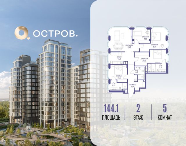 Продаётся многокомнатная квартира от застройщика: общая площадь 142.00 м², жилая 64.70 м², кухня 43.60 м², 9, жилой квартал "Остров 7", корпус 7 (7 квартал) (секция 1). срок сдачи: 4-кв. 2025. , 3 санузла: 1 раздельный и 2 совмещенных. В жилой зоне 2 больших окна на одну сторону, хорошая инсоляция. Позвоните сейчас и забронируйте квартиру! Купите квартиру в доме у прибрежного парка, в квартале ОСТРОВ.7. Это семь корпусов премиум- и бизнес-класса в одном из лучших мест ОСТРОВА - между бульваром и парком, поблизости от реки. Стильные корпуса имеют узнаваемый вид благодаря бионической пластике фасадов, приподнятых над землей. Для жителей предусмотрены детский клуб, фитнес-рум, коворкинг, переговорные, лаунжи. На крышах устроены видовые общественные пространства с зонами для отдыха и спорта. Двор расположен на двух уровнях: нижний ландшафтный парк и верхняя городская терраса. ОСТРОВ.7 - часть жилого комплекса на западе Москвы, в 15 минутах езды от центра. Это настоящий заповедник посреди большого города, в окружении реки и 650 га заповедников. Здесь все необходимое находится по соседству: от детского сада до супермаркета, от фитнес-зала до серфинг-центра. На территории созданы все условия для отдыха и общения: клубная инфраструктура в домах и дворы-парки, набережные и променады, маршруты для спортсменов, детей и возрастных жителей. В нескольких минутах ходьбы расположена станция метро "Терехово" БКЛ. На автомобиле - 10 минут до Москва-Сити и 15 минут до Садового кольца.